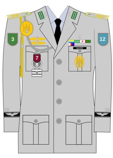 Keywords: Trageweise (Heer + Luftwaffe).svg de Zulässige Trageweise von Orden Ehrenzeichen Abzeichen und Kennzeichnungen an der Uniform des Heeres und der Luftwaffe 1 Schulterklappe mit Dienstgradabzeichen<br /> 2 Kragenspiegel<br /> 3 ausländisches binationales oder multinationales Verbandsabzeichen als Ärmelabzeichen Heer <br /> 4 Kompaniefeldwebel KpFw - Schnur<br /> 5 Schützenschnur nur Uffz u Msch <br /> 6 bis zu 2 Tätigkeitsabzeichen davon 1 ausländisches<br /> 7 internes Verbandsabzeichen<br /> 8 bis zu 2 Sonderabzeichen davon 1 ausländisches<br /> 9 Bandschnalle<br /> 10 Namensschild<br /> 11 Leistungsabzeichen<br /> 12 Verbandsabzeichen Heer <br /> 13 Ärmelband<br /> <br /> en Permissible Wearing of Orders decorations badges and markings on the uniform of the Army and Air Force 1 shoulder strap with insignia<br /> 2 collar patches<br /> 3 foreign binational or multinational badge as shoulder patches Army <br /> 4 Company sergeant major CSM - Cord<br /> 5 German Armed Forces Badge of Marksmanship only Sgt and Enlisted <br /> 6 up to 2 activity badges and 1 foreign<br /> 7 internal Badge<br /> 8 up to 2 special badges and 1 foreign<br /> 9 ribbon bar<br /> 10 nameplate<br /> 11 Badge for Military Proficiency<br /> 12 Higher Command Badge Army 13 Cuff title<br /> own File Trageweise Heer + Luftwaffe jpg Flor an Redraw of <gallery>File Trageweise Heer + Luftwaffe jpg</gallery> Army dress uniforms of Bundeswehr Air Force dress uniforms of Bundeswehr Military decorations of Germany Bundeswehr Illustrations of methods of wearing orders decorations and medals Cc-zero |