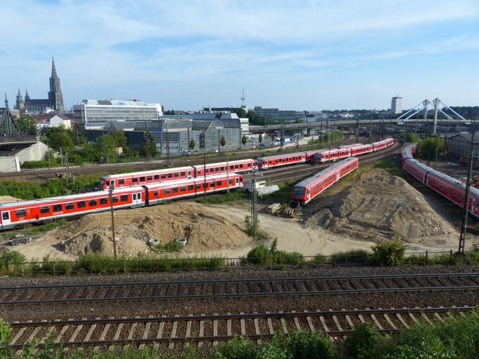 Keywords: train rail traffic gleise ulm locomotive traffic seemed railway site ulm cathedral ludwig erhard bridge