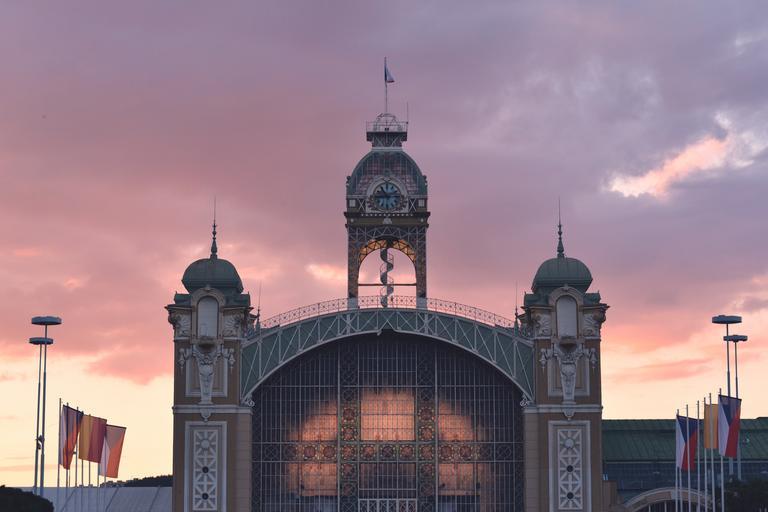 Keywords: train station main station exterior historic monument facade front window turret clock sunset evening architecture public transport city urban transport railway central terminal
