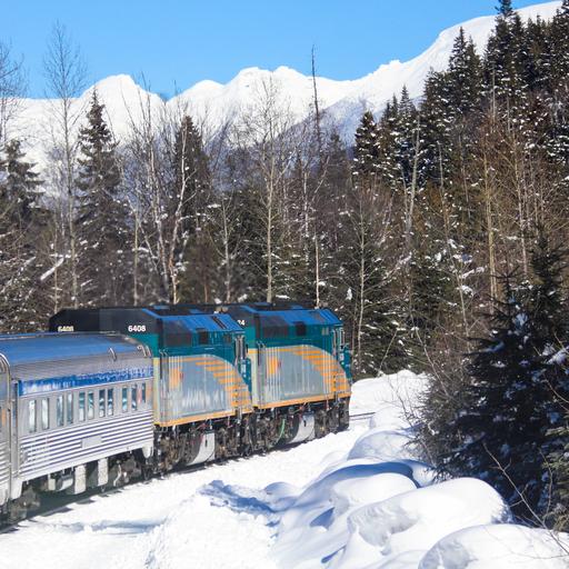 Keywords: train tracks winter snow trees evergreens hills railway transportation
