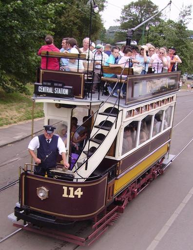 Keywords: Tram in the Beamish Museum.JPG Tram No 114 on the tramway at Beamish Museum County Durham England It's seen here at the Home Farm stop viewed from the south operating a southbound journey This elevated view is from the top deck of a bus in the road that passes in between the tram passing loop and the shelter out of shot on the right Own 2006-07-29 Immanuel Giel other versions Tram No 114 Beamish Museum 29 July 2006 jpg Newcastle Corporation Tramways No 114 Double-decker trams 2006 in tram transport in the United Kingdom July 2006 in County Durham Open-top trams |