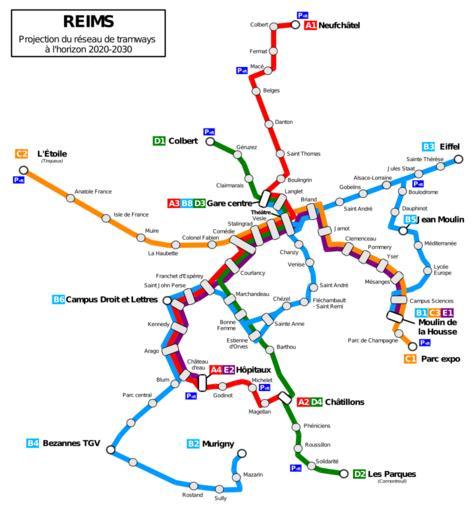 Keywords: Tram Reims Vision 2030.svg Projection d'un éventuel futur réseau de tramway à Reims France Inspiré de Image RERParisVision2025 png A vision for the future tramway network in Rheims France idea from Image RERParisVision2025 png Möglicher Endausbauzustand des Straßenbahnnetzes von Reims France Idee aus Image RERParisVision2025 png Travail personnel Projections dirigées par 1 les axes à renforcer en priorité tels que définis lors des enquêtes publiques et présentations au public du projet de la ligne A ; 2 la localisation des principaux pôles d'attraction du trafic et des plus fortes densités urbaines ; 3 les projets à long terme envisagés dans les plans d'aménagement urbain notamment projet ZAC de Bezannes-TGV ; 4 la charge observée des lignes d'autobus actuelles et la hiérarchie des lignes du projet actuel de réorganisation du réseau ; entre autres Own work made mostly from data presented at exhebitions about the first tramway line project 13 novembre 2007 November 13th 2007 Daiima Version gif à consulter en cas de problème d'affichage / gif version to be view in case of problems to display svg version Tram maps of Reims |