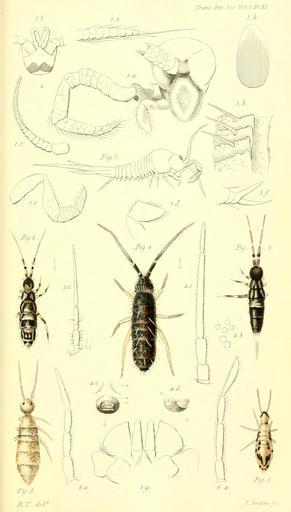 | Keywords: TransEntSocLond1plate11.jpg s of the Irish Species of Thysanura PLATE XI FORBICINA Geoff Sp 1 Polypoda Linn Plate XI Fig 1 Very common in dry stone ditches and mossy places Fig 1 Outline of the animal magnified la Head seen in front 1b Superiorly 1 c Antenna 1d Last joint of the palpus 1 e The foreleg 1f The hind foot 1g Jaws which are very thin and membranous 1 h Inside showing the auxiliary legs; the back is placed to the right 1 l The auxiliary foot with which it ascertains the presence of the object against which the tail is adpressed 1k A scale much magnified to show the lines producing the iridescence from 9 000 to 11 000 in an inch ORCHESELLA Sp 1 Orchesella filicornis Plate XI Fig 2 Fig 2 Insect magnified 2 a Left antenna Sp 2 Orchesella cincta vaga Fab Plate XI Fig 3 Fig 3 Insect magnified PODURA Linn Sp 1 Podura plumbea Linn Plate XL Fig 4 Fig 4 The insect magnified 4 a Left antenna 4 b Configuration of the left eyes 4c Represents the mouth; x the positions of the antennae; + a cylindric ring moveable and inclosing the manducatory organs ; ° the labium transverse striated longitudinally in the middle and with a minute hemispheric tubercle laterally closely adpressed against ° in the state of rest 4° The labrum fimbriated at its apex along the diameters of two convex semicircles placed on the basal part of the lip There is no appearance of lateral pieces internally or anything resembling maxillae These lips are moved to and fro with considerable rapidity but seem to have little prehensile power as they were unable to seize upon the minute hairs of the sable pencil which I passed into the mouth A singular apparatus is protruded from the 1st abdominal ring beneath which will be noticed under Podura stagnorum it is common to all the Podurae Sp 2 Podura nitida Plate XI Fig 5 Fig 5 Insect magnified 5 a Antenna of left side Sp 3 Podura nigro-maculata minuta Fab Plate XI Fig 6 Fig 6 Insect magnified 6a Antenna of left side seen in profile 2011-06-24 http //www biodiversitylibrary org Robert Templeton PD-old-100 Uploaded with UploadWizard Robert Templeton Plates Transactions of the Entomological Society of London |