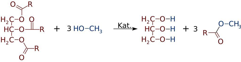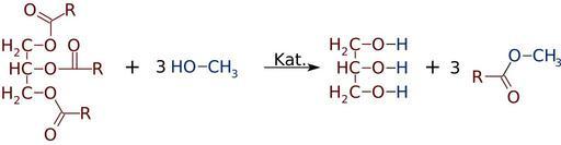 Keywords: Transesterification FAME.svg transesterification reaction scheme for the reaction of a en fat and en methanol to en glycerol and FAMEs own work done with http //bkchem zirael org/ BKchem and Inkscape 2008-04-23 Ertua PD-chem thumb left transesterification with two monovalent alcohols Esterification Fatty acid esters |