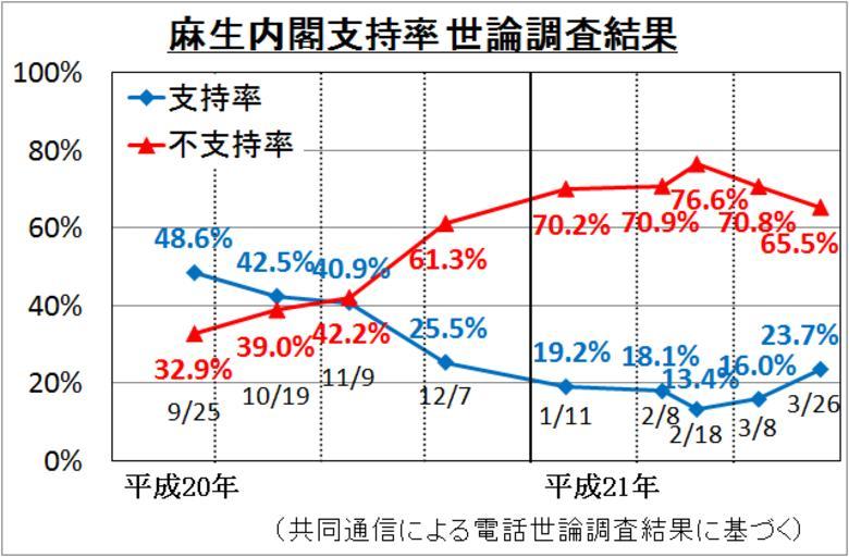 Keywords: Transition of the Aso cabinet's approval rating to 2008-09 from 2009-03.png ja wikipedia 2010 June 12 麻生内閣の支持率推移 2008年9 から2009年3 まで ja 共同 信社による電話世論調査結 2009-03-30 User Yhiroyuki 公 情報 thumb 2009年1 まで(読売新聞 共同 信) 共同 信社による電話世論調査結 wikitable + 平成20年 調査日 9 24日 25日 10 18日 19日 11 8日 9日 12 6日 7日 - 支持率 48 6 42 5 40 9 25 5 - 不支持率 32 9 39 0 42 2 61 3 wikitable + 平成21年 調査日 1 10日 11日 2 7日 8日 2 17日 18日 3 7日 8日 3 25日 26日 - 支持率 19 2 18 1 13 4 16 0 23 7 - 不支持率 70 2 70 9 76 6 70 8 65 5 出典 2009-03-30 Original uploader was Yhiroyuki at http //ja wikipedia org ja wikipedia ISOdate Link Yhiroyuki Original upload log ja wikipedia Kkkc CommonsHelper page ja wikipedia Transition_of_the_Aso_cabinet 27s_approval_rating_to_2008-09_from_2009-03 png 2009-03-31 15 54 Yhiroyuki 640×420× 31750 bytes <nowiki> 麻生内閣の支持率推移 2008年9 から2009年3 まで 共同 信社による電話世論調査結 2009/04/01 User Yhiroyuki 公 情報 PD-</nowiki> 2009-03-30 15 19 Yhiroyuki 640×420× 31711 bytes <nowiki> 麻生内閣の支持率推移 2008年9 から2009年3 まで 共同 信社による電話世論調査結 2009/03/30 User Yhiroyuki 公 情報 ファ�</nowiki> Approval ratings Kyodo News Cabinet of Japan Tarō Asō in 2008 Tarō Asō in 2009 2008 in Japan 2009 in Japan |
