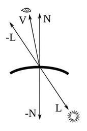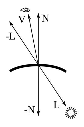 Keywords: Translucency Vectors.svg en A diagram showing the vectors used in calculating translucent surface lighting similar to the Phong reflection model relative to a surface point N the surface normal L normalized vector in direction of light source -L negative vector L in the opposite direction V normalized vector in direction of viewer Image originally created by User Fuzzypeg in Inkscape and modified by User Martin Kraus; released to the public domain 2011-06-27 own Martin Kraus cc-zero Uploaded with UploadWizard Illustrations |