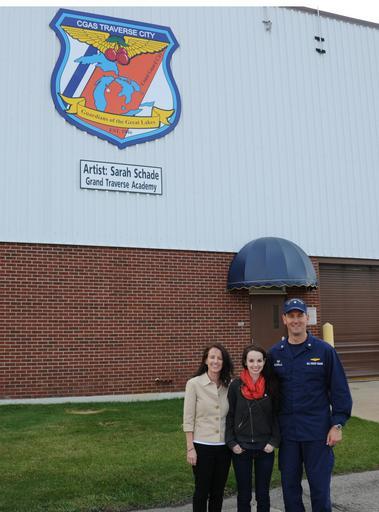 Keywords: Traverse City patch DVIDS1123707.jpg en Cmdr Joseph Buzzella commanding officer at Coast Guard Air Station Traverse City Mich poses for a picture with Sarah Schade winner of the air station's patch design contest and Sarah's mother Beverly Schade in front of the new patch now displayed on the air station's hangar at Cherry Capital Airport in Traverse City Oct 25 2012 Schade's winning design incorporated Traverse City's 2010 designation as a Coast Guard City Coast Guard photo by Lt j g James Okorn 2012-10-25 https //www dvidshub net/image/1123707 1123707 2013-12-13 02 12 PD-USGov CGAS Traverse City Images from DoD uploaded by Fæ |