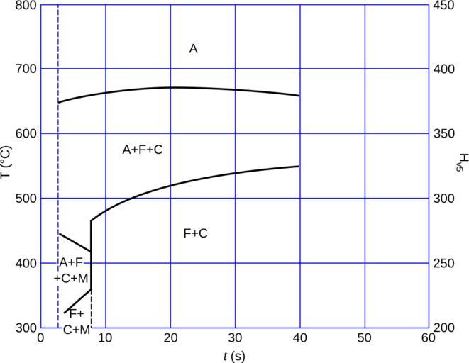 Keywords: TRCS P265GH.svg en Continuous cooling transformation diagram of EN P265GH ASTM A414 gr E for pressured appartus at high temperature warranted yield stress 265 MPa for welding fast cooling linear scale A austenite; C cementite F ferrite; M martensite fr Diagramme TRC du EN P265GH ASTM A414 gr E pour appareils à pression et haute température limite élastique garantie 265 MPa pour le soudage refroidissement rapide échelle linéaire A austénite; C cementite F ferrite; M martensite own Cdang 2009-05-29 Created with Inkscape Continuous cooling transformation diagrams Welding diagrams EN P265GH |