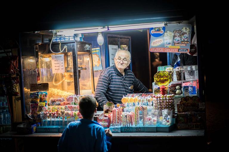 Keywords: treat market stand boy sweets belgrade old man sell candy