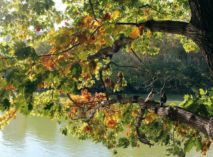 Keywords: tree leaves lake water fall nature branch autumn foliage beauty park outdoor green orange