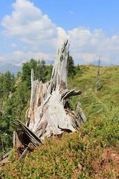 Keywords: tree stump mountain landscape vermoderndes wood pasture forest mountains dry root green field sky clouds trees