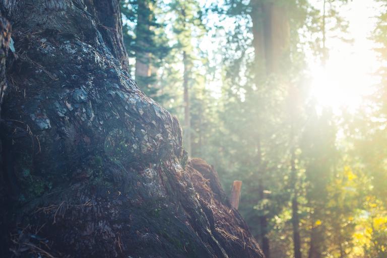 Keywords: tree trunk bark forest woods sun rays sunshine nature trees