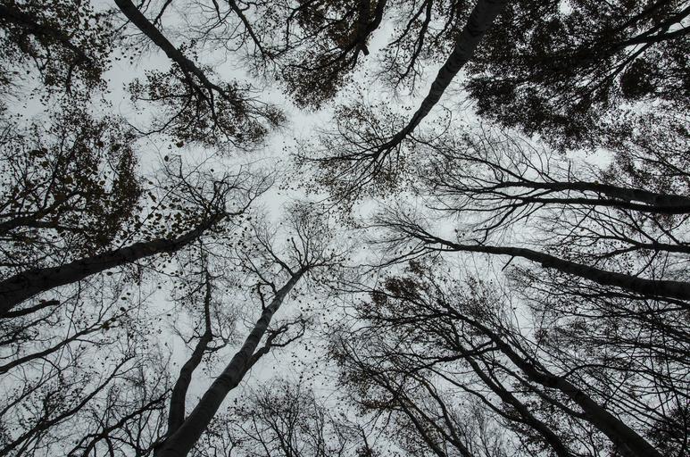 Keywords: trees perspective foliage up nature black and white forest woods leaves branches high view tranquil environment