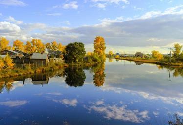Keywords: lake trees fall gold nature landscape forest river water background sunny fall reflection