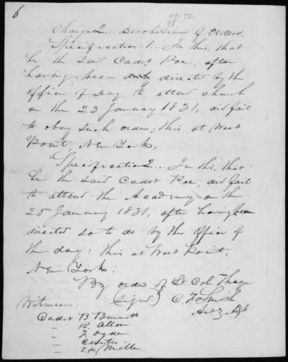Keywords: Trial of Cadet E. A. Poe - NARA - 301660.jpg Scope and content Poe arrived at West Point in June 1830 and submitted himself to the rigors and regimens of the Academy There were long days filled with study and military drills The food was poor the quarters crowded and spartan and discipline rigid Poe did well academically but was soon undone by continuing quarrels with his foster father and money problems During his first term he decided to leave West Point but could not resign without the consent of his foster father When Allen did not consent Poe set out to get himself court-martialed and dismissed He neglected his studies and failed to report for parades roll-calls and guard duty On January 28 1831 he was court-martialed These papers from the trial list charges against Cadet Poe gross neglect of duty and absence from his academical duties; on March 6 1831 he was dismissed from West Point by sentence of court-martial General notes Exhibit History American Originals December 1997 - December 1998 National Archives Washington DC Exhibit No 624 0196 301660 Local identifier War Department Office of the Judge Advocate General 1884 - 09/18/1947 Most Recent <br /> War Department The Adjutant General's Office 1821 - 04/28/1904 Predecessor <br /> War Department Bureau of Military Justice 1864 - 1884 Predecessor NARA-Author Poe Edgar Allan 1809-1849 Defendant 1307948 <br /> Archives I Reference Section Textual Archives Services Division NWCT1R National Archives Building 7th and Pennsylvania Avenue NW Washington DC 20408 1831-01-28 Record group Record Group 153 Records of the Office of the Judge Advocate General Army 1792 - 2010 Record group ARC 482 Court Martial Case Files compiled 12/1800 - 10/1894 Series ARC 301659 File unit File unit ARC Variant control numbers NAIL Control Number NWCTB-153-PC29E15-CC72 2 <br /> NAIL Control Number NWDT1-153-PC29E15-CC72 2 Other versions <gallery> File Trial_of_Cadet_E _A _Poe_-_NARA_-_301660 tif tif </gallery> NARA-cooperation PD-USGov United States Military Academy Edgar Allan Poe Courts martial 1831 documents United States military law |