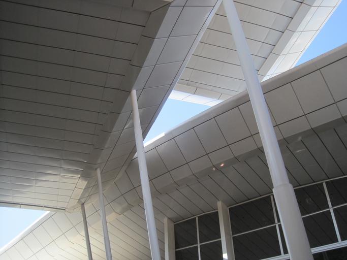 Keywords: triangles white blue blocks rectangles lines pattern structure levels surfaces window sky