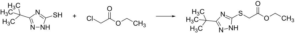 | Keywords: Triazamate synthesis (3).svg validSVG Reaction of 3- tert-butyl -1H-1 2 4-triazole-5-thiol and ethyl 2-chloroacetate to ethyl 2- 3- tert-butyl -1H-1 2 4-triazol-5-yl thio acetate Own 2014-05-02 Emeldir <span class signature-talk >talk</span> PD-chem Insecticide syntheses Condensation reactions |