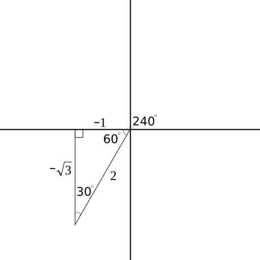 Keywords: TrigTriangleAt240Degrees.svg en A 30-60-90 degree triangle inscribed on a Cartesian plane at a 240 degree angle Created in Inkscape 2015-05-15 own Jbeyerl other versions Trigonometric triangles Uploaded with UploadWizard