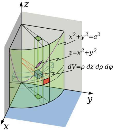 Keywords: Triple Integral Example.svg en A diagram depicting a worked triple integral example The questions is Find the volume of the region above the xy-plane bounded by the paraboloid z x 2+y 2 and the cylinder x 2+y 2 a 2 Own Inductiveload 2008-06-08 Integral calculus |