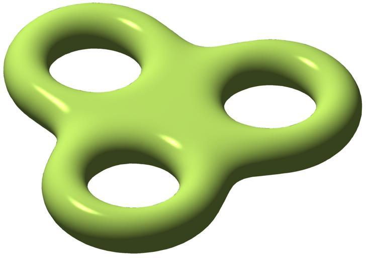 | Keywords: Triple torus illustration.png Illustration of a triple torus own MATLAB source code below Created with MATLAB 18 01 7 September 2007 UTC Oleg Alexandrov math Source code MATLAB <source lang matlab > function main illustration of a triple torus torus radii r 1; R 3; Kb R+r; Ks R-r; Km controls the smoothness of the transition from one ring to the others Km 0 5125 Kb; L 2 5 r+R ; h 0 2; grid size X -L h L; m length X ; Y -L h L; n length Y ; Z -1 1 r h 1 1 r ; k length Z ; W zeros m n k ; for i 1 length X for j 1 length Y x X i ; y Y j ; x y triple_torus_function x y r R Kb Km ; val sqrt x 2+y 2 -R 2-r 2; W i j val + Z 2; end end figure 1 ; clf; hold on; axis equal; axis off; light_green 184 224 98/256; light green H patch isosurface X Y Z W 0 ; isonormals X Y Z W H ; mycolor light_green; set H 'FaceColor' mycolor 'EdgeColor' 'none' 'FaceAlpha' 1 ; set H 'SpecularColorReflectance' 0 1 'DiffuseStrength' 0 8 ; set H 'FaceLighting' 'phong' 'AmbientStrength' 0 3 ; set H 'SpecularExponent' 108 ; daspect 1 1 1 ; axis tight; colormap prism 28 view -12 40 ; add in a source of light camlight -50 54 ; lighting phong; print '-dpng' '-r400' sprintf 'Triple_torus_illustration png' ; function x y triple_torus_function x y r R Kb Km a deformation in the plane which when comosed with a torus will give a triple torus center of one of the torii O -Kb -Kb/sqrt 3 ; angle 2 pi/3; Mat cos angle -sin angle ; sin angle cos angle ; p x y'; phi atan2 y x ; if phi > pi/6 phi < 5 pi/6 p Mat p; rotate 120 degree counterclockwise elseif phi > -pi/2 phi < pi/6 p Mat p; p Mat p; rotate 240 degrees counterclockwise end x p 1 ; y p 2 ; reflect against a line to merge two cases in one if y > x/sqrt 3 p x y; v cos 2 pi/3 sin 2 pi/3 ; p p - 2 v dot p v /dot v v ; x p 1 ; y p 2 ; end if x > O 1 project to the y axis to a point B if y < O 2 A O 1 y; B 0 y; else A O; p x y; rho norm p-O ; B O+ Kb/rho p-O ; t -O 1 / x-O 1 ; B 0 O 2 +t y-O 2 ; end p x y; d norm p-A ; q norm B-A ; d my_map d q Km ; p d/q B+ 1-d/q A; x p 1 ; y p 2 ; end shift towards the origin x x-O 1 ; y y-O 2 ; function y my_map x Kb Km if x > Kb y Km + 1; elseif x < Km y x; else y Km+sin pi/2 x-Km / Kb-Km ; end </source> Higher genus Files by User Oleg Alexandrov from en wikipedia Isosurfaces Images with Matlab source code math |