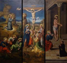 | Keywords: Tríptico del Calvario, CE2351P (Museo de Bellas Artes de Córdoba).jpg Artwork Anonymous El Tríptico del Calvario conservado en el Museo de Bellas Artes de Córdoba representa tres escenas de la Pasión de Jesucristo siendo una de ellas la Oración en el Huerto otra la Crucifixión y la última la flagelación de Cristo 1540 1545 oil tempera canvas cm 225 237 Institution Museo de Bellas Artes Córdoba Accession number CE2351P CE2352P CE2353P Credit line http //ceres mcu es/pages/Main Object history https //media-cdn tripadvisor com/media/photo-w/07/64/24/cf/anonimo-cordobes-triptico jpg PD-old-100 Other versions Tríptico del Calvario Museum of Fine Arts of Córdoba |