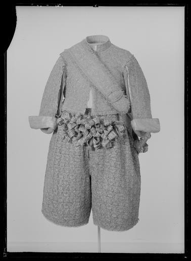 | Keywords: Tröja av guldlamé helt täckt av guldbroderi - Livrustkammaren - 18869.tif LSH artwork sv Förmodligen tillverkad i Frankrike Buren av Karl X Gustav 1622-1660 i samband med kröningen <br/>I 1671 års inventarium står En Klädningh som är gjord till H K Maij tz Lÿcklige Cröningh och sägs omfatta följande plagg nämligen kappa tröja byxor knäband skorosor och handskar I 1654 års klädkammarräkning förtecknas dräkten under nr 3 på följande sätt 1 klädning och kappa av filemort gul oskuren sammet helt broderad med guld och med 140 diamantknappar till tröjan och byxorna 1 par strumpeband och skoband av rik guldbrokad helt broderade med guld 1 par underbyxor av incarnadie rosa taft och silkesstrumpor av samma färg 1 guldbroderat med guld och stofferade med guldbrokad 1 panasch plym av couleur de feu röda filemort och aurorafärgade fjädrar 1 par förgyllda sporrar och 1 värja med förgyllt fäste <br/>Nu finns endast tröjan och byxorna i behåll i sitt skick som dräkt medan den stora rundskurna kappan inte längre omtalas i inventarierna efter 1691 1704 års inv säger inget om kappan men den finns förvandlad till mässhake och altarbrun i Riddarsholmskyrkan Skänkta dit den 1 april 1705 av Riksänkedrottningen Hedvig Eleonora Mässhaken Gjord av tjock gul rips OBS Fel Enl Sveriges kyrkor skall vara sammet oskuren ett material som skiljer sig från såväl tröjans som byxornas Broderad med mönster i guld på samma sätt som på tröjan och byxorna Mönsterrapport 8 x 8 cm Såväl fram- som bakstycket består av 2 hopsydda våder av c a 40 cm bredd max längd ca 90 cm Drottningens namnchiffer HRS samt ANNO 1705 har broderats på respektive fram- och baksidorna <br/>Tröjan är sydd av vad man med ett modernt namn skulle beteckna som guldlamé som helt täckts med guldbroderi Den är av s k innocenttyp d v s ett relativt kort livplagg med planschetter inlagda som styvnad i framstyckenas snibbiga främre hörn försett med 10 små skört ståndkrage och relativt korta ärmar med öppna sömmar framtill På vänster framstycke har 17 st 2 cm knapphål sytts med jämna mellanrum ca 1 cm från kanten Vad man bör lägga märke till är att tröjan sytts av ett större antal stycken som skarvats samman Förmodligen har plagget antingen redan varit i tidigare bruk före kröningen 1654 och blivit något förtrångt eller också har man misslyckats med passformen vid tillfället i fråga och har varit tvungen att göra en del ändringar Möjligheten att tröjan kan ha förändrats vid något senare tillfälle kan man inte heller bortse ifrån <br/>Bottenmaterialet består nämligen av två skilda lamétyger ett något gulare i de smalare skarvarna och f ö ett något rödare det egentliga materialet Tröjan är huvudsakligen skuren i 2 framstycken 2 ryggstycken samt 2 ärmstycken till vardera ärmen 10 skört samt krage Man kan alltså visa att framstyckena måste skarvas med remsor av det gulare tyget utefter de raka framkanterna samt även i sidsömmen I halsringningen har en liten kil satts in mellan det vertikala skarvstycket fram och axelsömmen Bakstyckena ha fått var sin vertikala skarv knappt 4 cm bred mitt i ryggen på ömse sidor om mittsömmen Utefter ärmarnas öppna långsidor har vertikala stycken fogats till och nere vid ärmens avslutning har på undersidans stycken en smal horisontell remsa sytts På överärmstycket däremot har en horisontell skarv satts in överst uppe vid ärmringningen Kragen är också uppklippt baktill och försedd med 2 små skarvstycken Det 3 e skörtet på varje sida är eventuellt nysytt ty dess färg förefaller ljusare broderiet är klumpigare och kompositionen annorlunda mot alla de övriga 8 som exempelvis har den lilla blomman nedtill i mitten <br/>Mönstret har i någon mån missuppfattats i de senare sydda styckena så har man t ex lagt krepiner och trådar i båge i stället för att klippa av dem och börja med en ny tråd Ärmarnas nedersta parti mellan 3 5-7 cm är lämnat utan broderi beroende på att det ju skulle vikas till uppslag Ärmarna har inga knappar eller knapphål intill sprunden vid handlederna I midjan sitter på insidan under skörten 8 st små tampar med vardera 2 hål för byxornas hakar Guldlamén har en vådbredd av minst 31 cm utan stad 45x15 tr/cm2 Varje inslag består av gult silke med 2 och 2 smala trinda guldtenar på rätan <br/>Analysresultat <br/>Metalltråd tvinnad med textiltråd huvudbeståndsdelar <br/>Silver xxx<br/>Guld x<br/>Koppar xxx<br/>Zink 0<br/>Det yttäckande läggsömsbroderiet består av kantiljer av trinda tenar och platta lan av olika bredd snodder med silkeskärna omtvinnade med guldlan strängar dragna av trinda tenar av guld eller silver som stansats ut i spiraler eller öglor och manglats platta på halva sidan här benämnda spiral- eller paljett strängar i brist på befintlig terminologi och 2 och 2 tätt liggande strängar med trinda smala guldtenar virade runt ett bredare guldanklätt snöre etc Broderiet är nersytt med gult silke Mönsterraporten är 6 5x6 5 cm Mönstret Ur 2 från varandra utåtböjda palmkvistar som strax nedanför mitten sammanhålles med en uppåtböjd båge växa omväxlande 5- och 8-flikiga icke naturalistiska blommor upp <br/>Analysresultat <br/>Metalltrådsbroderi huvudbeståndsdelar <br/>Silver xxx<br/>Guld xxx<br/>Koppar xxx<br/>Zink 0<br/>Tröjan är garnerad med en 2 3 cm bred knypplad uddspets av guldtråd med 2 inlagda guldlan Mönsterrapporten är c a 2 5 cm Spetsen sitter på bägge främre ytterkanterna knapparna har alltså suttit ovanpå spetsen och fortsätter därifrån omedelbart runt de 2 främre skörten Vidare sitter det spets runt de 3 ytterkanterna av varje skört på axel-och sidsömmarna runt ärmhålen och längs de öppna ärmsömmarna sprunden Den ursprungliga knäppningen finns inte längre kvar diamantknapparna lät änkedrottningen ta ur och använda för annat ändamål Numera knäppes tröjan med h