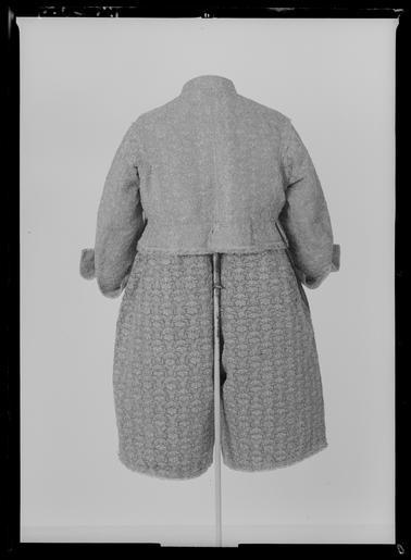 | Keywords: Tröja av guldlamé helt täckt av guldbroderi - Livrustkammaren - 61672.tif LSH artwork sv Förmodligen tillverkad i Frankrike Buren av Karl X Gustav 1622-1660 i samband med kröningen <br/>I 1671 års inventarium står En Klädningh som är gjord till H K Maij tz Lÿcklige Cröningh och sägs omfatta följande plagg nämligen kappa tröja byxor knäband skorosor och handskar I 1654 års klädkammarräkning förtecknas dräkten under nr 3 på följande sätt 1 klädning och kappa av filemort gul oskuren sammet helt broderad med guld och med 140 diamantknappar till tröjan och byxorna 1 par strumpeband och skoband av rik guldbrokad helt broderade med guld 1 par underbyxor av incarnadie rosa taft och silkesstrumpor av samma färg 1 guldbroderat med guld och stofferade med guldbrokad 1 panasch plym av couleur de feu röda filemort och aurorafärgade fjädrar 1 par förgyllda sporrar och 1 värja med förgyllt fäste <br/>Nu finns endast tröjan och byxorna i behåll i sitt skick som dräkt medan den stora rundskurna kappan inte längre omtalas i inventarierna efter 1691 1704 års inv säger inget om kappan men den finns förvandlad till mässhake och altarbrun i Riddarsholmskyrkan Skänkta dit den 1 april 1705 av Riksänkedrottningen Hedvig Eleonora Mässhaken Gjord av tjock gul rips OBS Fel Enl Sveriges kyrkor skall vara sammet oskuren ett material som skiljer sig från såväl tröjans som byxornas Broderad med mönster i guld på samma sätt som på tröjan och byxorna Mönsterrapport 8 x 8 cm Såväl fram- som bakstycket består av 2 hopsydda våder av c a 40 cm bredd max längd ca 90 cm Drottningens namnchiffer HRS samt ANNO 1705 har broderats på respektive fram- och baksidorna <br/>Tröjan är sydd av vad man med ett modernt namn skulle beteckna som guldlamé som helt täckts med guldbroderi Den är av s k innocenttyp d v s ett relativt kort livplagg med planschetter inlagda som styvnad i framstyckenas snibbiga främre hörn försett med 10 små skört ståndkrage och relativt korta ärmar med öppna sömmar framtill På vänster framstycke har 17 st 2 cm knapphål sytts med jämna mellanrum ca 1 cm från kanten Vad man bör lägga märke till är att tröjan sytts av ett större antal stycken som skarvats samman Förmodligen har plagget antingen redan varit i tidigare bruk före kröningen 1654 och blivit något förtrångt eller också har man misslyckats med passformen vid tillfället i fråga och har varit tvungen att göra en del ändringar Möjligheten att tröjan kan ha förändrats vid något senare tillfälle kan man inte heller bortse ifrån <br/>Bottenmaterialet består nämligen av två skilda lamétyger ett något gulare i de smalare skarvarna och f ö ett något rödare det egentliga materialet Tröjan är huvudsakligen skuren i 2 framstycken 2 ryggstycken samt 2 ärmstycken till vardera ärmen 10 skört samt krage Man kan alltså visa att framstyckena måste skarvas med remsor av det gulare tyget utefter de raka framkanterna samt även i sidsömmen I halsringningen har en liten kil satts in mellan det vertikala skarvstycket fram och axelsömmen Bakstyckena ha fått var sin vertikala skarv knappt 4 cm bred mitt i ryggen på ömse sidor om mittsömmen Utefter ärmarnas öppna långsidor har vertikala stycken fogats till och nere vid ärmens avslutning har på undersidans stycken en smal horisontell remsa sytts På överärmstycket däremot har en horisontell skarv satts in överst uppe vid ärmringningen Kragen är också uppklippt baktill och försedd med 2 små skarvstycken Det 3 e skörtet på varje sida är eventuellt nysytt ty dess färg förefaller ljusare broderiet är klumpigare och kompositionen annorlunda mot alla de övriga 8 som exempelvis har den lilla blomman nedtill i mitten <br/>Mönstret har i någon mån missuppfattats i de senare sydda styckena så har man t ex lagt krepiner och trådar i båge i stället för att klippa av dem och börja med en ny tråd Ärmarnas nedersta parti mellan 3 5-7 cm är lämnat utan broderi beroende på att det ju skulle vikas till uppslag Ärmarna har inga knappar eller knapphål intill sprunden vid handlederna I midjan sitter på insidan under skörten 8 st små tampar med vardera 2 hål för byxornas hakar Guldlamén har en vådbredd av minst 31 cm utan stad 45x15 tr/cm2 Varje inslag består av gult silke med 2 och 2 smala trinda guldtenar på rätan <br/>Analysresultat <br/>Metalltråd tvinnad med textiltråd huvudbeståndsdelar <br/>Silver xxx<br/>Guld x<br/>Koppar xxx<br/>Zink 0<br/>Det yttäckande läggsömsbroderiet består av kantiljer av trinda tenar och platta lan av olika bredd snodder med silkeskärna omtvinnade med guldlan strängar dragna av trinda tenar av guld eller silver som stansats ut i spiraler eller öglor och manglats platta på halva sidan här benämnda spiral- eller paljett strängar i brist på befintlig terminologi och 2 och 2 tätt liggande strängar med trinda smala guldtenar virade runt ett bredare guldanklätt snöre etc Broderiet är nersytt med gult silke Mönsterraporten är 6 5x6 5 cm Mönstret Ur 2 från varandra utåtböjda palmkvistar som strax nedanför mitten sammanhålles med en uppåtböjd båge växa omväxlande 5- och 8-flikiga icke naturalistiska blommor upp <br/>Analysresultat <br/>Metalltrådsbroderi huvudbeståndsdelar <br/>Silver xxx<br/>Guld xxx<br/>Koppar xxx<br/>Zink 0<br/>Tröjan är garnerad med en 2 3 cm bred knypplad uddspets av guldtråd med 2 inlagda guldlan Mönsterrapporten är c a 2 5 cm Spetsen sitter på bägge främre ytterkanterna knapparna har alltså suttit ovanpå spetsen och fortsätter därifrån omedelbart runt de 2 främre skörten Vidare sitter det spets runt de 3 ytterkanterna av varje skört på axel-och sidsömmarna runt ärmhålen och längs de öppna ärmsömmarna sprunden Den ursprungliga knäppningen finns inte längre kvar diamantknapparna lät änkedrottningen ta ur och använda för annat ändamål Numera knäppes tröjan med h