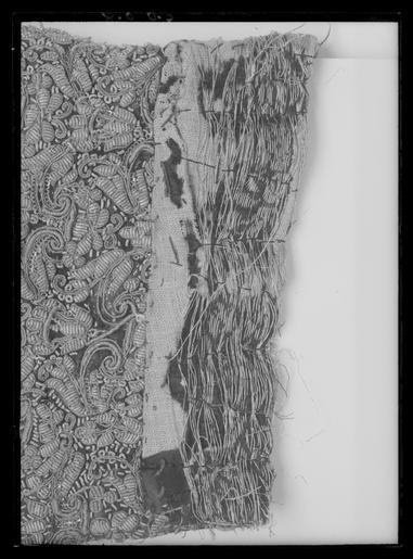 Keywords: Tröja av svart atlas, 1650-tal - Livrustkammaren - 35809.tif Detta är en dräkt som man mycket gärna skulle vilja sätta i samband med Karl X Gustavs kröning men det finns ännu inget dokumentariskt bevis för detta dräkten ingår ev i fransyska varorna Det är en synnerligen rikt utstyrd dräkt och den har såväl i sitt broderi som i sin foder brokad en ovanligt hög guldhalt I 1671 års inventarium sägs det att dräkten utgörs av kappa tröja byxor knäband skorosor och handskar Allt av svart atlas med Gull heelöfwer borderat Numera är tyvärr dräkten inte längre så fullständig både 1671 och 1676 års inventarier vittnar visserligen om kappans existens men därefter är den försvunnen man hade redan 1671 tagit bort spetsarna av guld och 20 år senare omtalas kappan ej längre Nuvarande inventarium omtalar blott tröja byxor och 1 handske Under ett annat inventarienummer 3435 har emellertid kunnat identifieras ett dräkttillbehör nämligen ett gehäng med samma broderi Den svarta atlasen har en vådbredd av ca 53 cm utan stad Staden är 1 3 cm bred 10 gröna 10 vita 10 gröna 10 vita 10 gröna samt 5 tjocka svarta trådar - tuskaft Trådarnas antal kan variera Det hela ytan täckande broderiet är utfört i läggsöm och har en mönsterrapport av h 10 cm b 6 8 cm Det är utfört med olika sorters guldkantiljer samt paljettsträngar Längs en del kantsömmar har man sytt på ett smalt guldsnöre bestående av en tvinnad tråd omspunnen med lan Broderiet är nersytt med vitt och gult silke samt tjockare rosa lintråd <br/><br/>Analysresultat Tråd och lan av legerat guld huvudbeståndsdelar <br/>Silver xx<br/>Guld xxx<br/>Koppar xxx<br/>Zink 0<br/><br/>Mönstret är ett stiliserat blomstermönster där ett ringformigt omtag snarast utvecklats till en krona som utdragna klockliknande blomkalkar vända sig till eller ifrån I plaggen kan man observera att broderiet uppvisar olika kvaliteter och här kan även spåras skarvar i tyget underlaget De tillskurna bitarna uppvisa en klumpigare torrare karaktär i broderiets utförande samt smärre avvikelser från det gängse utförandet Så t ex har i tröjan den lilla 5-bladiga blomman ovanför kronan sitt översta mellersta blad sytt med horisontella kantiljer istället för vertikala som det borde varit Mönstret är också gyttrigare och oredigare Kronans tinnar är omramade av i öglor lagda konturtrådar och ej som i det ursprungliga broderiet där konturen går upp och ned <br/>Mönsterrapport ca h 77 mm b 58 mm Tröjan av innocenttyp är sydd med 2 framstycken som utökats såväl upptill på axelpartiet som utefter ärmringningen och längs sidosömmen med tillsatta bitar I ryggen har skarvstyckena infogats längs en mittsöm ursprungligen kunde ryggstycket ha varit helt Nu ligger emellertid på ömse sidor mittsömmen en smal blott 1 5 cm bred skarv Likaså har man även baktill gjort tröjan något längre genom skarvar utefter axel- och halsringningarna Ärmarna har bara utvidgats obetydligt genom en skarvad remsa utefter underärmstyckets bakre övre del samt på bägge styckena nertill utefter ytterkantens söm ärmsprundets sida ca 27 cm Kragen har klippts upp på samma sätt som ryggstycket så att intill mittsömmen 2 små skarvstycken ligga på ömse sidor synbarligen även placerade upp- och nedvända Tröjan har 10 skört och i midjesömmen sitta på insidan 8 st byxtampar vardera med 2 hål Fodret utgöres av guldbrokad med svart botten Det har en vådbredd av minst 47 cm ev ca52 x 14 á 15 tr/cm2 Det är en ripsvävnad med varp av svart otvinnat silke Inslagen är 14 st med gult silke högertvinnad med guldlan samt 14 st med gult silke högertvinnad med guldlan samt 14 st svarta med guldlan på rätan Stad ca 1 3 cm 8 gröna 9 vita 12 gröna 8 vita 11 gröna 6 svarta trådar - de färgade i atlasbindning de svarta i lärftsbindning Mönsterrapport h 7 7 cm b 5 8 Mönstret består av halvnaturalistiska små blomsterkvistar <br/><br/>Analysresultat Metalltråd tvinnad med textiltråd huvudbeståndsdelar <br/>Silver xxx<br/>Guld xx<br/>Koppar xx<br/>Zink 0<br/><br/>Då fodret är mycket trasigt och slitet har man fodrat in kragen och den övre delen av tröjan med svart taft Skörten som ju också är fodrade med brokaden har fått bitar av denna på varierande led Man har givetvis velat utnyttja det dyrbara materialet till fullo I framkanten på vänster sida har tröjan en knapphålsrad med 23 knapphål 2 cm långa På motstående sida finns 22 knappar i behåll de är 1 2 cm i diameter Knapphålsraden är på undersidan fodrad med guldbrokad av samma typ som finns i byxornas fickor Nertill i framstyckena finns planschetter som når t o m det 13 e knapphålet eller är ca 22 cm långa Dessa är klädda med något grövre linnelärft än den oblekta linnelärft som utgör mellanfoder i tröjan 23x18 tr/cm2 Det finns 3 knappar med tränsar i ståndkragen Knapparna är överklädda med olika guldtrådar lan och kantiljer I midjan på tröjan har man mellan fodren lagt en avklippt stadremsa vävd randig i gult och orange med svart som ev är en avklippt stad från någon annan dräkts tyg ev den oskurna svarta sammetsdräkten nr 3421 Detta för att ge mera styrsel åt plagget Att man klippt till plaggets olika delar och beräknat sömmarnas placering innan man broderat dem visar bl a ärmarnas nedre parti som på den broderade sidan ju skulle vikas till uppslag De har alltså ej behövt broderas ända ned utan man har lämnat den svarta atlasen bar på ett knappt 10 cm brett stycke Blott mitt fram på högra sidan under knappraden finns en knypplad ca 1 7 cm bred guldspets med guldlan kvar original caption Karl X Gustavs kröning Kristinas kröning Karl X Gustav och Hedvig Eleonoras bröllop 1647 LRK Karl X Gustav av Sverige Modelejon 2002 place of origin original filename LN_B12774_015654 55955 inventory number LRK 19340 35809 CC0 Tröja av svart atlas 1650-tal - Livrustkammaren - 35809-negative tif <g