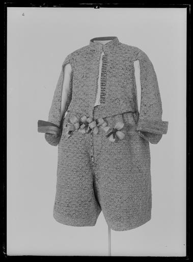 Keywords: Tröja av svart atlas, 1650-tal - Livrustkammaren - 27430.tif LSH artwork Friderich Feuerbrun pärlstickare David Pärlestickare pärlstickare sv Detta är en dräkt som man mycket gärna skulle vilja sätta i samband med Karl X Gustavs kröning men det finns ännu inget dokumentariskt bevis för detta dräkten ingår ev i fransyska varorna Det är en synnerligen rikt utstyrd dräkt och den har såväl i sitt broderi som i sin foder brokad en ovanligt hög guldhalt I 1671 års inventarium sägs det att dräkten utgörs av kappa tröja byxor knäband skorosor och handskar Allt av svart atlas med Gull heelöfwer borderat Numera är tyvärr dräkten inte längre så fullständig både 1671 och 1676 års inventarier vittnar visserligen om kappans existens men därefter är den försvunnen man hade redan 1671 tagit bort spetsarna av guld och 20 år senare omtalas kappan ej längre Nuvarande inventarium omtalar blott tröja byxor och 1 handske Under ett annat inventarienummer 3435 har emellertid kunnat identifieras ett dräkttillbehör nämligen ett gehäng med samma broderi Den svarta atlasen har en vådbredd av ca 53 cm utan stad Staden är 1 3 cm bred 10 gröna 10 vita 10 gröna 10 vita 10 gröna samt 5 tjocka svarta trådar - tuskaft Trådarnas antal kan variera Det hela ytan täckande broderiet är utfört i läggsöm och har en mönsterrapport av h 10 cm b 6 8 cm Det är utfört med olika sorters guldkantiljer samt paljettsträngar Längs en del kantsömmar har man sytt på ett smalt guldsnöre bestående av en tvinnad tråd omspunnen med lan Broderiet är nersytt med vitt och gult silke samt tjockare rosa lintråd <br/>Analysresultat Tråd och lan av legerat guld huvudbeståndsdelar <br/>Silver xx<br/>Guld xxx<br/>Koppar xxx<br/>Zink 0<br/>Mönstret är ett stiliserat blomstermönster där ett ringformigt omtag snarast utvecklats till en krona som utdragna klockliknande blomkalkar vända sig till eller ifrån I plaggen kan man observera att broderiet uppvisar olika kvaliteter och här kan även spåras skarvar i tyget underlaget De tillskurna bitarna uppvisa en klumpigare torrare karaktär i broderiets utförande samt smärre avvikelser från det gängse utförandet Så t ex har i tröjan den lilla 5-bladiga blomman ovanför kronan sitt översta mellersta blad sytt med horisontella kantiljer istället för vertikala som det borde varit Mönstret är också gyttrigare och oredigare Kronans tinnar är omramade av i öglor lagda konturtrådar och ej som i det ursprungliga broderiet där konturen går upp och ned <br/>Mönsterrapport ca h 77 mm b 58 mm Tröjan av innocenttyp är sydd med 2 framstycken som utökats såväl upptill på axelpartiet som utefter ärmringningen och längs sidosömmen med tillsatta bitar I ryggen har skarvstyckena infogats längs en mittsöm ursprungligen kunde ryggstycket ha varit helt Nu ligger emellertid på ömse sidor mittsömmen en smal blott 1 5 cm bred skarv Likaså har man även baktill gjort tröjan något längre genom skarvar utefter axel- och halsringningarna Ärmarna har bara utvidgats obetydligt genom en skarvad remsa utefter underärmstyckets bakre övre del samt på bägge styckena nertill utefter ytterkantens söm ärmsprundets sida ca 27 cm Kragen har klippts upp på samma sätt som ryggstycket så att intill mittsömmen 2 små skarvstycken ligga på ömse sidor synbarligen även placerade upp- och nedvända Tröjan har 10 skört och i midjesömmen sitta på insidan 8 st byxtampar vardera med 2 hål Fodret utgöres av guldbrokad med svart botten Det har en vådbredd av minst 47 cm ev ca52 x 14 á 15 tr/cm2 Det är en ripsvävnad med varp av svart otvinnat silke Inslagen är 14 st med gult silke högertvinnad med guldlan samt 14 st med gult silke högertvinnad med guldlan samt 14 st svarta med guldlan på rätan Stad ca 1 3 cm 8 gröna 9 vita 12 gröna 8 vita 11 gröna 6 svarta trådar - de färgade i atlasbindning de svarta i lärftsbindning Mönsterrapport h 7 7 cm b 5 8 Mönstret består av halvnaturalistiska små blomsterkvistar <br/>Analysresultat Metalltråd tvinnad med textiltråd huvudbeståndsdelar <br/>Silver xxx<br/>Guld xx<br/>Koppar xx<br/>Zink 0<br/>Då fodret är mycket trasigt och slitet har man fodrat in kragen och den övre delen av tröjan med svart taft Skörten som ju också är fodrade med brokaden har fått bitar av denna på varierande led Man har givetvis velat utnyttja det dyrbara materialet till fullo I framkanten på vänster sida har tröjan en knapphålsrad med 23 knapphål 2 cm långa På motstående sida finns 22 knappar i behåll de är 1 2 cm i diameter Knapphålsraden är på undersidan fodrad med guldbrokad av samma typ som finns i byxornas fickor Nertill i framstyckena finns planschetter som når t o m det 13 e knapphålet eller är ca 22 cm långa Dessa är klädda med något grövre linnelärft än den oblekta linnelärft som utgör mellanfoder i tröjan 23x18 tr/cm2 Det finns 3 knappar med tränsar i ståndkragen Knapparna är överklädda med olika guldtrådar lan och kantiljer I midjan på tröjan har man mellan fodren lagt en avklippt stadremsa vävd randig i gult och orange med svart som ev är en avklippt stad från någon annan dräkts tyg ev den oskurna svarta sammetsdräkten nr 3421 Detta för att ge mera styrsel åt plagget Att man klippt till plaggets olika delar och beräknat sömmarnas placering innan man broderat dem visar bl a ärmarnas nedre parti som på den broderade sidan ju skulle vikas till uppslag De har alltså ej behövt broderas ända ned utan man har lämnat den svarta atlasen bar på ett knappt 10 cm brett stycke Blott mitt fram på högra sidan under knappraden finns en knypplad ca 1 7 cm bred guldspets med guldlan kvar original caption Karl X Gustavs kröning Kristinas kröning Karl X Gustav och Hedvig Eleonoras bröllop 1647 brocade d2 - dräkt - foder material guldbrokad - silk Färg svart d1 - dräkt - yttermaterial material atlas LRK Karl X Gustav av Sverige Modelej