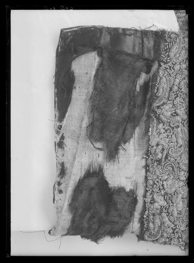 Keywords: Tröja av svart atlas, 1650-tal - Livrustkammaren - 44367.tif Detta är en dräkt som man mycket gärna skulle vilja sätta i samband med Karl X Gustavs kröning men det finns ännu inget dokumentariskt bevis för detta dräkten ingår ev i fransyska varorna Det är en synnerligen rikt utstyrd dräkt och den har såväl i sitt broderi som i sin foder brokad en ovanligt hög guldhalt I 1671 års inventarium sägs det att dräkten utgörs av kappa tröja byxor knäband skorosor och handskar Allt av svart atlas med Gull heelöfwer borderat Numera är tyvärr dräkten inte längre så fullständig både 1671 och 1676 års inventarier vittnar visserligen om kappans existens men därefter är den försvunnen man hade redan 1671 tagit bort spetsarna av guld och 20 år senare omtalas kappan ej längre Nuvarande inventarium omtalar blott tröja byxor och 1 handske Under ett annat inventarienummer 3435 har emellertid kunnat identifieras ett dräkttillbehör nämligen ett gehäng med samma broderi Den svarta atlasen har en vådbredd av ca 53 cm utan stad Staden är 1 3 cm bred 10 gröna 10 vita 10 gröna 10 vita 10 gröna samt 5 tjocka svarta trådar - tuskaft Trådarnas antal kan variera Det hela ytan täckande broderiet är utfört i läggsöm och har en mönsterrapport av h 10 cm b 6 8 cm Det är utfört med olika sorters guldkantiljer samt paljettsträngar Längs en del kantsömmar har man sytt på ett smalt guldsnöre bestående av en tvinnad tråd omspunnen med lan Broderiet är nersytt med vitt och gult silke samt tjockare rosa lintråd <br/><br/>Analysresultat Tråd och lan av legerat guld huvudbeståndsdelar <br/>Silver xx<br/>Guld xxx<br/>Koppar xxx<br/>Zink 0<br/><br/>Mönstret är ett stiliserat blomstermönster där ett ringformigt omtag snarast utvecklats till en krona som utdragna klockliknande blomkalkar vända sig till eller ifrån I plaggen kan man observera att broderiet uppvisar olika kvaliteter och här kan även spåras skarvar i tyget underlaget De tillskurna bitarna uppvisa en klumpigare torrare karaktär i broderiets utförande samt smärre avvikelser från det gängse utförandet Så t ex har i tröjan den lilla 5-bladiga blomman ovanför kronan sitt översta mellersta blad sytt med horisontella kantiljer istället för vertikala som det borde varit Mönstret är också gyttrigare och oredigare Kronans tinnar är omramade av i öglor lagda konturtrådar och ej som i det ursprungliga broderiet där konturen går upp och ned <br/>Mönsterrapport ca h 77 mm b 58 mm Tröjan av innocenttyp är sydd med 2 framstycken som utökats såväl upptill på axelpartiet som utefter ärmringningen och längs sidosömmen med tillsatta bitar I ryggen har skarvstyckena infogats längs en mittsöm ursprungligen kunde ryggstycket ha varit helt Nu ligger emellertid på ömse sidor mittsömmen en smal blott 1 5 cm bred skarv Likaså har man även baktill gjort tröjan något längre genom skarvar utefter axel- och halsringningarna Ärmarna har bara utvidgats obetydligt genom en skarvad remsa utefter underärmstyckets bakre övre del samt på bägge styckena nertill utefter ytterkantens söm ärmsprundets sida ca 27 cm Kragen har klippts upp på samma sätt som ryggstycket så att intill mittsömmen 2 små skarvstycken ligga på ömse sidor synbarligen även placerade upp- och nedvända Tröjan har 10 skört och i midjesömmen sitta på insidan 8 st byxtampar vardera med 2 hål Fodret utgöres av guldbrokad med svart botten Det har en vådbredd av minst 47 cm ev ca52 x 14 á 15 tr/cm2 Det är en ripsvävnad med varp av svart otvinnat silke Inslagen är 14 st med gult silke högertvinnad med guldlan samt 14 st med gult silke högertvinnad med guldlan samt 14 st svarta med guldlan på rätan Stad ca 1 3 cm 8 gröna 9 vita 12 gröna 8 vita 11 gröna 6 svarta trådar - de färgade i atlasbindning de svarta i lärftsbindning Mönsterrapport h 7 7 cm b 5 8 Mönstret består av halvnaturalistiska små blomsterkvistar <br/><br/>Analysresultat Metalltråd tvinnad med textiltråd huvudbeståndsdelar <br/>Silver xxx<br/>Guld xx<br/>Koppar xx<br/>Zink 0<br/><br/>Då fodret är mycket trasigt och slitet har man fodrat in kragen och den övre delen av tröjan med svart taft Skörten som ju också är fodrade med brokaden har fått bitar av denna på varierande led Man har givetvis velat utnyttja det dyrbara materialet till fullo I framkanten på vänster sida har tröjan en knapphålsrad med 23 knapphål 2 cm långa På motstående sida finns 22 knappar i behåll de är 1 2 cm i diameter Knapphålsraden är på undersidan fodrad med guldbrokad av samma typ som finns i byxornas fickor Nertill i framstyckena finns planschetter som når t o m det 13 e knapphålet eller är ca 22 cm långa Dessa är klädda med något grövre linnelärft än den oblekta linnelärft som utgör mellanfoder i tröjan 23x18 tr/cm2 Det finns 3 knappar med tränsar i ståndkragen Knapparna är överklädda med olika guldtrådar lan och kantiljer I midjan på tröjan har man mellan fodren lagt en avklippt stadremsa vävd randig i gult och orange med svart som ev är en avklippt stad från någon annan dräkts tyg ev den oskurna svarta sammetsdräkten nr 3421 Detta för att ge mera styrsel åt plagget Att man klippt till plaggets olika delar och beräknat sömmarnas placering innan man broderat dem visar bl a ärmarnas nedre parti som på den broderade sidan ju skulle vikas till uppslag De har alltså ej behövt broderas ända ned utan man har lämnat den svarta atlasen bar på ett knappt 10 cm brett stycke Blott mitt fram på högra sidan under knappraden finns en knypplad ca 1 7 cm bred guldspets med guldlan kvar original caption Karl X Gustavs kröning Kristinas kröning Karl X Gustav och Hedvig Eleonoras bröllop 1647 LRK Karl X Gustav av Sverige Modelejon 2002 place of origin original filename LN_B12775_015655 55955 inventory number LRK 19340 44367 CC0 Tröja av svart atlas 1650-tal - Livrustkammaren - 44367-negative tif <g