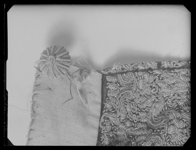 Keywords: Tröja av svart atlas och guldbrokad, 1650-tal - Livrustkammaren - 71067.tif LSH artwork Friderich Feuerbrun pärlstickare David Pärlestickare pärlstickare sv Dräkten införskaffades från Frankrike 1647 säkerligen inför drottning Kristinas kröning Många skarvar visar att dräkten kommit till användning vid senare tillfällen då den måst ändras efter ägarens tilltagande kroppsvolm Detta är en dräkt som man mycket gärna skulle vilja sätta i samband med Karl X Gustavs kröning men det finns ännu inget dokumentariskt bevis för detta dräkten ingår ev i fransyska varorna Det är en synnerligen rikt utstyrd dräkt och den har såväl i sitt broderi som i sin foder brokad en ovanligt hög guldhalt I 1671 års inventarium sägs det att dräkten utgörs av kappa tröja byxor knäband skorosor och handskar Allt av svart atlas med Gull heelöfwer borderat Numera är tyvärr dräkten inte längre så fullständig både 1671 och 1676 års inventarier vittnar visserligen om kappans existens men därefter är den försvunnen man hade redan 1671 tagit bort spetsarna av guld och 20 år senare omtalas kappan ej längre Nuvarande inventarium omtalar blott tröja byxor och 1 handske Under ett annat inventarienummer 3435 har emellertid kunnat identifieras ett dräkttillbehör nämligen ett gehäng med samma broderi Den svarta atlasen har en vådbredd av ca 53 cm utan stad Staden är 1 3 cm bred 10 gröna 10 vita 10 gröna 10 vita 10 gröna samt 5 tjocka svarta trådar - tuskaft Trådarnas antal kan variera Det hela ytan täckande broderiet är utfört i läggsöm och har en mönsterrapport av h 10 cm b 6 8 cm Det är utfört med olika sorters guldkantiljer samt paljettsträngar Längs en del kantsömmar har man sytt på ett smalt guldsnöre bestående av en tvinnad tråd omspunnen med lan Broderiet är nersytt med vitt och gult silke samt tjockare rosa lintråd Analysresultat Tråd och lan av legerat guld huvudbeståndsdelar Silver xxGuld xxxKoppar xxxZink 0Mönstret är ett stiliserat blomstermönster där ett ringformigt omtag snarast utvecklats till en krona som utdragna klockliknande blomkalkar vända sig till eller ifrån I plaggen kan man observera att broderiet uppvisar olika kvaliteter och här kan även spåras skarvar i tyget underlaget De tillskurna bitarna uppvisa en klumpigare torrare karaktär i broderiets utförande samt smärre avvikelser från det gängse utförandet Så t ex har i tröjan den lilla 5-bladiga blomman ovanför kronan sitt översta mellersta blad sytt med horisontella kantiljer istället för vertikala som det borde varit Mönstret är också gyttrigare och oredigare Kronans tinnar är omramade av i öglor lagda konturtrådar och ej som i det ursprungliga broderiet där konturen går upp och ned Mönsterrapport ca h 77 mm b 58 mm Tröjan av innocenttyp är sydd med 2 framstycken som utökats såväl upptill på axelpartiet som utefter ärmringningen och längs sidosömmen med tillsatta bitar I ryggen har skarvstyckena infogats längs en mittsöm ursprungligen kunde ryggstycket ha varit helt Nu ligger emellertid på ömse sidor mittsömmen en smal blott 1 5 cm bred skarv Likaså har man även baktill gjort tröjan något längre genom skarvar utefter axel- och halsringningarna Ärmarna har bara utvidgats obetydligt genom en skarvad remsa utefter underärmstyckets bakre övre del samt på bägge styckena nertill utefter ytterkantens söm ärmsprundets sida ca 27 cm Kragen har klippts upp på samma sätt som ryggstycket så att intill mittsömmen 2 små skarvstycken ligga på ömse sidor synbarligen även placerade upp- och nedvända Tröjan har 10 skört och i midjesömmen sitta på insidan 8 st byxtampar vardera med 2 hål Fodret utgöres av guldbrokad med svart botten Det har en vådbredd av minst 47 cm ev ca52 x 14 á 15 tr/cm2 Det är en ripsvävnad med varp av svart otvinnat silke Inslagen är 14 st med gult silke högertvinnad med guldlan samt 14 st med gult silke högertvinnad med guldlan samt 14 st svarta med guldlan på rätan Stad ca 1 3 cm 8 gröna 9 vita 12 gröna 8 vita 11 gröna 6 svarta trådar - de färgade i atlasbindning de svarta i lärftsbindning Mönsterrapport h 7 7 cm b 5 8 Mönstret består av halvnaturalistiska små blomsterkvistar Analysresultat Metalltråd tvinnad med textiltråd huvudbeståndsdelar Silver xxxGuld xxKoppar xxZink 0Då fodret är mycket trasigt och slitet har man fodrat in kragen och den övre delen av tröjan med svart taft Skörten som ju också är fodrade med brokaden har fått bitar av denna på varierande led Man har givetvis velat utnyttja det dyrbara materialet till fullo I framkanten på vänster sida har tröjan en knapphålsrad med 23 knapphål 2 cm långa På motstående sida finns 22 knappar i behåll de är 1 2 cm i diameter Knapphålsraden är på undersidan fodrad med guldbrokad av samma typ som finns i byxornas fickor Nertill i framstyckena finns planschetter som når t o m det 13 e knapphålet eller är ca 22 cm långa Dessa är klädda med något grövre linnelärft än den oblekta linnelärft som utgör mellanfoder i tröjan 23x18 tr/cm2 Det finns 3 knappar med tränsar i ståndkragen Knapparna är överklädda med olika guldtrådar lan och kantiljer I midjan på tröjan har man mellan fodren lagt en avklippt stadremsa vävd randig i gult och orange med svart som ev är en avklippt stad från någon annan dräkts tyg ev den oskurna svarta sammetsdräkten nr 3421 Detta för att ge mera styrsel åt plagget Att man klippt till plaggets olika delar och beräknat sömmarnas placering innan man broderat dem visar bl a ärmarnas nedre parti som på den broderade sidan ju skulle vikas till uppslag De har alltså ej behövt broderas ända ned utan man har lämnat den svarta atlasen bar på ett knappt 10 cm brett stycke Blott mitt fram på högra sidan under knappraden finns en knypplad ca 1 7 cm bred guldspets med guldlan kvar original caption Kristinas kröning Karl X Gustavs kröning Karl X Gus