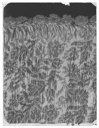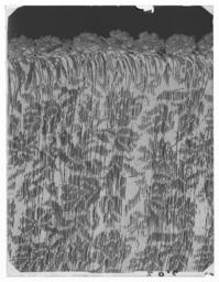 Keywords: Tröja av svart atlas och guldbrokad, 1650-tal - Livrustkammaren - 11054-negative.tif LSH artwork Friderich Feuerbrun pärlstickare David Pärlestickare pärlstickare sv Dräkten införskaffades från Frankrike 1647 säkerligen inför drottning Kristinas kröning Många skarvar visar att dräkten kommit till användning vid senare tillfällen då den måst ändras efter ägarens tilltagande kroppsvolm Detta är en dräkt som man mycket gärna skulle vilja sätta i samband med Karl X Gustavs kröning men det finns ännu inget dokumentariskt bevis för detta dräkten ingår ev i fransyska varorna Det är en synnerligen rikt utstyrd dräkt och den har såväl i sitt broderi som i sin foder brokad en ovanligt hög guldhalt I 1671 års inventarium sägs det att dräkten utgörs av kappa tröja byxor knäband skorosor och handskar Allt av svart atlas med Gull heelöfwer borderat Numera är tyvärr dräkten inte längre så fullständig både 1671 och 1676 års inventarier vittnar visserligen om kappans existens men därefter är den försvunnen man hade redan 1671 tagit bort spetsarna av guld och 20 år senare omtalas kappan ej längre Nuvarande inventarium omtalar blott tröja byxor och 1 handske Under ett annat inventarienummer 3435 har emellertid kunnat identifieras ett dräkttillbehör nämligen ett gehäng med samma broderi Den svarta atlasen har en vådbredd av ca 53 cm utan stad Staden är 1 3 cm bred 10 gröna 10 vita 10 gröna 10 vita 10 gröna samt 5 tjocka svarta trådar - tuskaft Trådarnas antal kan variera Det hela ytan täckande broderiet är utfört i läggsöm och har en mönsterrapport av h 10 cm b 6 8 cm Det är utfört med olika sorters guldkantiljer samt paljettsträngar Längs en del kantsömmar har man sytt på ett smalt guldsnöre bestående av en tvinnad tråd omspunnen med lan Broderiet är nersytt med vitt och gult silke samt tjockare rosa lintråd Analysresultat Tråd och lan av legerat guld huvudbeståndsdelar Silver xxGuld xxxKoppar xxxZink 0Mönstret är ett stiliserat blomstermönster där ett ringformigt omtag snarast utvecklats till en krona som utdragna klockliknande blomkalkar vända sig till eller ifrån I plaggen kan man observera att broderiet uppvisar olika kvaliteter och här kan även spåras skarvar i tyget underlaget De tillskurna bitarna uppvisa en klumpigare torrare karaktär i broderiets utförande samt smärre avvikelser från det gängse utförandet Så t ex har i tröjan den lilla 5-bladiga blomman ovanför kronan sitt översta mellersta blad sytt med horisontella kantiljer istället för vertikala som det borde varit Mönstret är också gyttrigare och oredigare Kronans tinnar är omramade av i öglor lagda konturtrådar och ej som i det ursprungliga broderiet där konturen går upp och ned Mönsterrapport ca h 77 mm b 58 mm Tröjan av innocenttyp är sydd med 2 framstycken som utökats såväl upptill på axelpartiet som utefter ärmringningen och längs sidosömmen med tillsatta bitar I ryggen har skarvstyckena infogats längs en mittsöm ursprungligen kunde ryggstycket ha varit helt Nu ligger emellertid på ömse sidor mittsömmen en smal blott 1 5 cm bred skarv Likaså har man även baktill gjort tröjan något längre genom skarvar utefter axel- och halsringningarna Ärmarna har bara utvidgats obetydligt genom en skarvad remsa utefter underärmstyckets bakre övre del samt på bägge styckena nertill utefter ytterkantens söm ärmsprundets sida ca 27 cm Kragen har klippts upp på samma sätt som ryggstycket så att intill mittsömmen 2 små skarvstycken ligga på ömse sidor synbarligen även placerade upp- och nedvända Tröjan har 10 skört och i midjesömmen sitta på insidan 8 st byxtampar vardera med 2 hål Fodret utgöres av guldbrokad med svart botten Det har en vådbredd av minst 47 cm ev ca52 x 14 á 15 tr/cm2 Det är en ripsvävnad med varp av svart otvinnat silke Inslagen är 14 st med gult silke högertvinnad med guldlan samt 14 st med gult silke högertvinnad med guldlan samt 14 st svarta med guldlan på rätan Stad ca 1 3 cm 8 gröna 9 vita 12 gröna 8 vita 11 gröna 6 svarta trådar - de färgade i atlasbindning de svarta i lärftsbindning Mönsterrapport h 7 7 cm b 5 8 Mönstret består av halvnaturalistiska små blomsterkvistar Analysresultat Metalltråd tvinnad med textiltråd huvudbeståndsdelar Silver xxxGuld xxKoppar xxZink 0Då fodret är mycket trasigt och slitet har man fodrat in kragen och den övre delen av tröjan med svart taft Skörten som ju också är fodrade med brokaden har fått bitar av denna på varierande led Man har givetvis velat utnyttja det dyrbara materialet till fullo I framkanten på vänster sida har tröjan en knapphålsrad med 23 knapphål 2 cm långa På motstående sida finns 22 knappar i behåll de är 1 2 cm i diameter Knapphålsraden är på undersidan fodrad med guldbrokad av samma typ som finns i byxornas fickor Nertill i framstyckena finns planschetter som når t o m det 13 e knapphålet eller är ca 22 cm långa Dessa är klädda med något grövre linnelärft än den oblekta linnelärft som utgör mellanfoder i tröjan 23x18 tr/cm2 Det finns 3 knappar med tränsar i ståndkragen Knapparna är överklädda med olika guldtrådar lan och kantiljer I midjan på tröjan har man mellan fodren lagt en avklippt stadremsa vävd randig i gult och orange med svart som ev är en avklippt stad från någon annan dräkts tyg ev den oskurna svarta sammetsdräkten nr 3421 Detta för att ge mera styrsel åt plagget Att man klippt till plaggets olika delar och beräknat sömmarnas placering innan man broderat dem visar bl a ärmarnas nedre parti som på den broderade sidan ju skulle vikas till uppslag De har alltså ej behövt broderas ända ned utan man har lämnat den svarta atlasen bar på ett knappt 10 cm brett stycke Blott mitt fram på högra sidan under knappraden finns en knypplad ca 1 7 cm bred guldspets med guldlan kvar original caption Kristinas kröning Karl X Gustavs kröning K