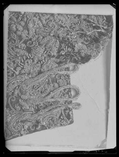 Keywords: Tröja av svart atlas och guldbrokad, 1650-tal - Livrustkammaren - 45382.tif LSH artwork Friderich Feuerbrun pärlstickare David Pärlestickare pärlstickare sv Dräkten införskaffades från Frankrike 1647 säkerligen inför drottning Kristinas kröning Många skarvar visar att dräkten kommit till användning vid senare tillfällen då den måst ändras efter ägarens tilltagande kroppsvolm Detta är en dräkt som man mycket gärna skulle vilja sätta i samband med Karl X Gustavs kröning men det finns ännu inget dokumentariskt bevis för detta dräkten ingår ev i fransyska varorna Det är en synnerligen rikt utstyrd dräkt och den har såväl i sitt broderi som i sin foder brokad en ovanligt hög guldhalt I 1671 års inventarium sägs det att dräkten utgörs av kappa tröja byxor knäband skorosor och handskar Allt av svart atlas med Gull heelöfwer borderat Numera är tyvärr dräkten inte längre så fullständig både 1671 och 1676 års inventarier vittnar visserligen om kappans existens men därefter är den försvunnen man hade redan 1671 tagit bort spetsarna av guld och 20 år senare omtalas kappan ej längre Nuvarande inventarium omtalar blott tröja byxor och 1 handske Under ett annat inventarienummer 3435 har emellertid kunnat identifieras ett dräkttillbehör nämligen ett gehäng med samma broderi Den svarta atlasen har en vådbredd av ca 53 cm utan stad Staden är 1 3 cm bred 10 gröna 10 vita 10 gröna 10 vita 10 gröna samt 5 tjocka svarta trådar - tuskaft Trådarnas antal kan variera Det hela ytan täckande broderiet är utfört i läggsöm och har en mönsterrapport av h 10 cm b 6 8 cm Det är utfört med olika sorters guldkantiljer samt paljettsträngar Längs en del kantsömmar har man sytt på ett smalt guldsnöre bestående av en tvinnad tråd omspunnen med lan Broderiet är nersytt med vitt och gult silke samt tjockare rosa lintråd Analysresultat Tråd och lan av legerat guld huvudbeståndsdelar Silver xxGuld xxxKoppar xxxZink 0Mönstret är ett stiliserat blomstermönster där ett ringformigt omtag snarast utvecklats till en krona som utdragna klockliknande blomkalkar vända sig till eller ifrån I plaggen kan man observera att broderiet uppvisar olika kvaliteter och här kan även spåras skarvar i tyget underlaget De tillskurna bitarna uppvisa en klumpigare torrare karaktär i broderiets utförande samt smärre avvikelser från det gängse utförandet Så t ex har i tröjan den lilla 5-bladiga blomman ovanför kronan sitt översta mellersta blad sytt med horisontella kantiljer istället för vertikala som det borde varit Mönstret är också gyttrigare och oredigare Kronans tinnar är omramade av i öglor lagda konturtrådar och ej som i det ursprungliga broderiet där konturen går upp och ned Mönsterrapport ca h 77 mm b 58 mm Tröjan av innocenttyp är sydd med 2 framstycken som utökats såväl upptill på axelpartiet som utefter ärmringningen och längs sidosömmen med tillsatta bitar I ryggen har skarvstyckena infogats längs en mittsöm ursprungligen kunde ryggstycket ha varit helt Nu ligger emellertid på ömse sidor mittsömmen en smal blott 1 5 cm bred skarv Likaså har man även baktill gjort tröjan något längre genom skarvar utefter axel- och halsringningarna Ärmarna har bara utvidgats obetydligt genom en skarvad remsa utefter underärmstyckets bakre övre del samt på bägge styckena nertill utefter ytterkantens söm ärmsprundets sida ca 27 cm Kragen har klippts upp på samma sätt som ryggstycket så att intill mittsömmen 2 små skarvstycken ligga på ömse sidor synbarligen även placerade upp- och nedvända Tröjan har 10 skört och i midjesömmen sitta på insidan 8 st byxtampar vardera med 2 hål Fodret utgöres av guldbrokad med svart botten Det har en vådbredd av minst 47 cm ev ca52 x 14 á 15 tr/cm2 Det är en ripsvävnad med varp av svart otvinnat silke Inslagen är 14 st med gult silke högertvinnad med guldlan samt 14 st med gult silke högertvinnad med guldlan samt 14 st svarta med guldlan på rätan Stad ca 1 3 cm 8 gröna 9 vita 12 gröna 8 vita 11 gröna 6 svarta trådar - de färgade i atlasbindning de svarta i lärftsbindning Mönsterrapport h 7 7 cm b 5 8 Mönstret består av halvnaturalistiska små blomsterkvistar Analysresultat Metalltråd tvinnad med textiltråd huvudbeståndsdelar Silver xxxGuld xxKoppar xxZink 0Då fodret är mycket trasigt och slitet har man fodrat in kragen och den övre delen av tröjan med svart taft Skörten som ju också är fodrade med brokaden har fått bitar av denna på varierande led Man har givetvis velat utnyttja det dyrbara materialet till fullo I framkanten på vänster sida har tröjan en knapphålsrad med 23 knapphål 2 cm långa På motstående sida finns 22 knappar i behåll de är 1 2 cm i diameter Knapphålsraden är på undersidan fodrad med guldbrokad av samma typ som finns i byxornas fickor Nertill i framstyckena finns planschetter som når t o m det 13 e knapphålet eller är ca 22 cm långa Dessa är klädda med något grövre linnelärft än den oblekta linnelärft som utgör mellanfoder i tröjan 23x18 tr/cm2 Det finns 3 knappar med tränsar i ståndkragen Knapparna är överklädda med olika guldtrådar lan och kantiljer I midjan på tröjan har man mellan fodren lagt en avklippt stadremsa vävd randig i gult och orange med svart som ev är en avklippt stad från någon annan dräkts tyg ev den oskurna svarta sammetsdräkten nr 3421 Detta för att ge mera styrsel åt plagget Att man klippt till plaggets olika delar och beräknat sömmarnas placering innan man broderat dem visar bl a ärmarnas nedre parti som på den broderade sidan ju skulle vikas till uppslag De har alltså ej behövt broderas ända ned utan man har lämnat den svarta atlasen bar på ett knappt 10 cm brett stycke Blott mitt fram på högra sidan under knappraden finns en knypplad ca 1 7 cm bred guldspets med guldlan kvar original caption Kristinas kröning Karl X Gustavs kröning Karl X Gus