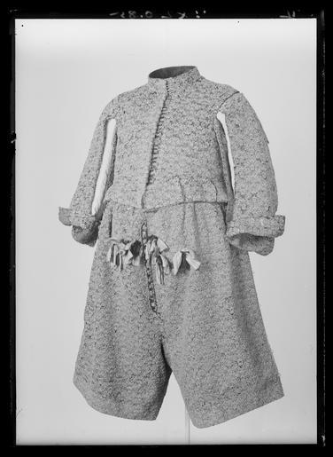 Keywords: Tröja av svart atlas, 1650-tal - Livrustkammaren - 52705.tif Detta är en dräkt som man mycket gärna skulle vilja sätta i samband med Karl X Gustavs kröning men det finns ännu inget dokumentariskt bevis för detta dräkten ingår ev i fransyska varorna Det är en synnerligen rikt utstyrd dräkt och den har såväl i sitt broderi som i sin foder brokad en ovanligt hög guldhalt I 1671 års inventarium sägs det att dräkten utgörs av kappa tröja byxor knäband skorosor och handskar Allt av svart atlas med Gull heelöfwer borderat Numera är tyvärr dräkten inte längre så fullständig både 1671 och 1676 års inventarier vittnar visserligen om kappans existens men därefter är den försvunnen man hade redan 1671 tagit bort spetsarna av guld och 20 år senare omtalas kappan ej längre Nuvarande inventarium omtalar blott tröja byxor och 1 handske Under ett annat inventarienummer 3435 har emellertid kunnat identifieras ett dräkttillbehör nämligen ett gehäng med samma broderi Den svarta atlasen har en vådbredd av ca 53 cm utan stad Staden är 1 3 cm bred 10 gröna 10 vita 10 gröna 10 vita 10 gröna samt 5 tjocka svarta trådar - tuskaft Trådarnas antal kan variera Det hela ytan täckande broderiet är utfört i läggsöm och har en mönsterrapport av h 10 cm b 6 8 cm Det är utfört med olika sorters guldkantiljer samt paljettsträngar Längs en del kantsömmar har man sytt på ett smalt guldsnöre bestående av en tvinnad tråd omspunnen med lan Broderiet är nersytt med vitt och gult silke samt tjockare rosa lintråd <br/><br/>Analysresultat Tråd och lan av legerat guld huvudbeståndsdelar <br/>Silver xx<br/>Guld xxx<br/>Koppar xxx<br/>Zink 0<br/><br/>Mönstret är ett stiliserat blomstermönster där ett ringformigt omtag snarast utvecklats till en krona som utdragna klockliknande blomkalkar vända sig till eller ifrån I plaggen kan man observera att broderiet uppvisar olika kvaliteter och här kan även spåras skarvar i tyget underlaget De tillskurna bitarna uppvisa en klumpigare torrare karaktär i broderiets utförande samt smärre avvikelser från det gängse utförandet Så t ex har i tröjan den lilla 5-bladiga blomman ovanför kronan sitt översta mellersta blad sytt med horisontella kantiljer istället för vertikala som det borde varit Mönstret är också gyttrigare och oredigare Kronans tinnar är omramade av i öglor lagda konturtrådar och ej som i det ursprungliga broderiet där konturen går upp och ned <br/>Mönsterrapport ca h 77 mm b 58 mm Tröjan av innocenttyp är sydd med 2 framstycken som utökats såväl upptill på axelpartiet som utefter ärmringningen och längs sidosömmen med tillsatta bitar I ryggen har skarvstyckena infogats längs en mittsöm ursprungligen kunde ryggstycket ha varit helt Nu ligger emellertid på ömse sidor mittsömmen en smal blott 1 5 cm bred skarv Likaså har man även baktill gjort tröjan något längre genom skarvar utefter axel- och halsringningarna Ärmarna har bara utvidgats obetydligt genom en skarvad remsa utefter underärmstyckets bakre övre del samt på bägge styckena nertill utefter ytterkantens söm ärmsprundets sida ca 27 cm Kragen har klippts upp på samma sätt som ryggstycket så att intill mittsömmen 2 små skarvstycken ligga på ömse sidor synbarligen även placerade upp- och nedvända Tröjan har 10 skört och i midjesömmen sitta på insidan 8 st byxtampar vardera med 2 hål Fodret utgöres av guldbrokad med svart botten Det har en vådbredd av minst 47 cm ev ca52 x 14 á 15 tr/cm2 Det är en ripsvävnad med varp av svart otvinnat silke Inslagen är 14 st med gult silke högertvinnad med guldlan samt 14 st med gult silke högertvinnad med guldlan samt 14 st svarta med guldlan på rätan Stad ca 1 3 cm 8 gröna 9 vita 12 gröna 8 vita 11 gröna 6 svarta trådar - de färgade i atlasbindning de svarta i lärftsbindning Mönsterrapport h 7 7 cm b 5 8 Mönstret består av halvnaturalistiska små blomsterkvistar <br/><br/>Analysresultat Metalltråd tvinnad med textiltråd huvudbeståndsdelar <br/>Silver xxx<br/>Guld xx<br/>Koppar xx<br/>Zink 0<br/><br/>Då fodret är mycket trasigt och slitet har man fodrat in kragen och den övre delen av tröjan med svart taft Skörten som ju också är fodrade med brokaden har fått bitar av denna på varierande led Man har givetvis velat utnyttja det dyrbara materialet till fullo I framkanten på vänster sida har tröjan en knapphålsrad med 23 knapphål 2 cm långa På motstående sida finns 22 knappar i behåll de är 1 2 cm i diameter Knapphålsraden är på undersidan fodrad med guldbrokad av samma typ som finns i byxornas fickor Nertill i framstyckena finns planschetter som når t o m det 13 e knapphålet eller är ca 22 cm långa Dessa är klädda med något grövre linnelärft än den oblekta linnelärft som utgör mellanfoder i tröjan 23x18 tr/cm2 Det finns 3 knappar med tränsar i ståndkragen Knapparna är överklädda med olika guldtrådar lan och kantiljer I midjan på tröjan har man mellan fodren lagt en avklippt stadremsa vävd randig i gult och orange med svart som ev är en avklippt stad från någon annan dräkts tyg ev den oskurna svarta sammetsdräkten nr 3421 Detta för att ge mera styrsel åt plagget Att man klippt till plaggets olika delar och beräknat sömmarnas placering innan man broderat dem visar bl a ärmarnas nedre parti som på den broderade sidan ju skulle vikas till uppslag De har alltså ej behövt broderas ända ned utan man har lämnat den svarta atlasen bar på ett knappt 10 cm brett stycke Blott mitt fram på högra sidan under knappraden finns en knypplad ca 1 7 cm bred guldspets med guldlan kvar original caption Karl X Gustavs kröning Kristinas kröning Karl X Gustav och Hedvig Eleonoras bröllop 1647 LRK Karl X Gustav av Sverige Modelejon 2002 place of origin original filename LN_B10546_013426 55955 inventory number LRK 19340 52705 CC0 Tröja av svart atlas 1650-tal - Livrustkammaren - 52705-negative tif <g