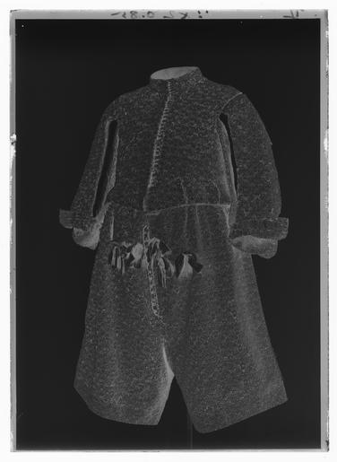 Keywords: Tröja av svart atlas, 1650-tal - Livrustkammaren - 52705-negative.tif Detta är en dräkt som man mycket gärna skulle vilja sätta i samband med Karl X Gustavs kröning men det finns ännu inget dokumentariskt bevis för detta dräkten ingår ev i fransyska varorna Det är en synnerligen rikt utstyrd dräkt och den har såväl i sitt broderi som i sin foder brokad en ovanligt hög guldhalt I 1671 års inventarium sägs det att dräkten utgörs av kappa tröja byxor knäband skorosor och handskar Allt av svart atlas med Gull heelöfwer borderat Numera är tyvärr dräkten inte längre så fullständig både 1671 och 1676 års inventarier vittnar visserligen om kappans existens men därefter är den försvunnen man hade redan 1671 tagit bort spetsarna av guld och 20 år senare omtalas kappan ej längre Nuvarande inventarium omtalar blott tröja byxor och 1 handske Under ett annat inventarienummer 3435 har emellertid kunnat identifieras ett dräkttillbehör nämligen ett gehäng med samma broderi Den svarta atlasen har en vådbredd av ca 53 cm utan stad Staden är 1 3 cm bred 10 gröna 10 vita 10 gröna 10 vita 10 gröna samt 5 tjocka svarta trådar - tuskaft Trådarnas antal kan variera Det hela ytan täckande broderiet är utfört i läggsöm och har en mönsterrapport av h 10 cm b 6 8 cm Det är utfört med olika sorters guldkantiljer samt paljettsträngar Längs en del kantsömmar har man sytt på ett smalt guldsnöre bestående av en tvinnad tråd omspunnen med lan Broderiet är nersytt med vitt och gult silke samt tjockare rosa lintråd <br/><br/>Analysresultat Tråd och lan av legerat guld huvudbeståndsdelar <br/>Silver xx<br/>Guld xxx<br/>Koppar xxx<br/>Zink 0<br/><br/>Mönstret är ett stiliserat blomstermönster där ett ringformigt omtag snarast utvecklats till en krona som utdragna klockliknande blomkalkar vända sig till eller ifrån I plaggen kan man observera att broderiet uppvisar olika kvaliteter och här kan även spåras skarvar i tyget underlaget De tillskurna bitarna uppvisa en klumpigare torrare karaktär i broderiets utförande samt smärre avvikelser från det gängse utförandet Så t ex har i tröjan den lilla 5-bladiga blomman ovanför kronan sitt översta mellersta blad sytt med horisontella kantiljer istället för vertikala som det borde varit Mönstret är också gyttrigare och oredigare Kronans tinnar är omramade av i öglor lagda konturtrådar och ej som i det ursprungliga broderiet där konturen går upp och ned <br/>Mönsterrapport ca h 77 mm b 58 mm Tröjan av innocenttyp är sydd med 2 framstycken som utökats såväl upptill på axelpartiet som utefter ärmringningen och längs sidosömmen med tillsatta bitar I ryggen har skarvstyckena infogats längs en mittsöm ursprungligen kunde ryggstycket ha varit helt Nu ligger emellertid på ömse sidor mittsömmen en smal blott 1 5 cm bred skarv Likaså har man även baktill gjort tröjan något längre genom skarvar utefter axel- och halsringningarna Ärmarna har bara utvidgats obetydligt genom en skarvad remsa utefter underärmstyckets bakre övre del samt på bägge styckena nertill utefter ytterkantens söm ärmsprundets sida ca 27 cm Kragen har klippts upp på samma sätt som ryggstycket så att intill mittsömmen 2 små skarvstycken ligga på ömse sidor synbarligen även placerade upp- och nedvända Tröjan har 10 skört och i midjesömmen sitta på insidan 8 st byxtampar vardera med 2 hål Fodret utgöres av guldbrokad med svart botten Det har en vådbredd av minst 47 cm ev ca52 x 14 á 15 tr/cm2 Det är en ripsvävnad med varp av svart otvinnat silke Inslagen är 14 st med gult silke högertvinnad med guldlan samt 14 st med gult silke högertvinnad med guldlan samt 14 st svarta med guldlan på rätan Stad ca 1 3 cm 8 gröna 9 vita 12 gröna 8 vita 11 gröna 6 svarta trådar - de färgade i atlasbindning de svarta i lärftsbindning Mönsterrapport h 7 7 cm b 5 8 Mönstret består av halvnaturalistiska små blomsterkvistar <br/><br/>Analysresultat Metalltråd tvinnad med textiltråd huvudbeståndsdelar <br/>Silver xxx<br/>Guld xx<br/>Koppar xx<br/>Zink 0<br/><br/>Då fodret är mycket trasigt och slitet har man fodrat in kragen och den övre delen av tröjan med svart taft Skörten som ju också är fodrade med brokaden har fått bitar av denna på varierande led Man har givetvis velat utnyttja det dyrbara materialet till fullo I framkanten på vänster sida har tröjan en knapphålsrad med 23 knapphål 2 cm långa På motstående sida finns 22 knappar i behåll de är 1 2 cm i diameter Knapphålsraden är på undersidan fodrad med guldbrokad av samma typ som finns i byxornas fickor Nertill i framstyckena finns planschetter som når t o m det 13 e knapphålet eller är ca 22 cm långa Dessa är klädda med något grövre linnelärft än den oblekta linnelärft som utgör mellanfoder i tröjan 23x18 tr/cm2 Det finns 3 knappar med tränsar i ståndkragen Knapparna är överklädda med olika guldtrådar lan och kantiljer I midjan på tröjan har man mellan fodren lagt en avklippt stadremsa vävd randig i gult och orange med svart som ev är en avklippt stad från någon annan dräkts tyg ev den oskurna svarta sammetsdräkten nr 3421 Detta för att ge mera styrsel åt plagget Att man klippt till plaggets olika delar och beräknat sömmarnas placering innan man broderat dem visar bl a ärmarnas nedre parti som på den broderade sidan ju skulle vikas till uppslag De har alltså ej behövt broderas ända ned utan man har lämnat den svarta atlasen bar på ett knappt 10 cm brett stycke Blott mitt fram på högra sidan under knappraden finns en knypplad ca 1 7 cm bred guldspets med guldlan kvar original caption Karl X Gustavs kröning Kristinas kröning Karl X Gustav och Hedvig Eleonoras bröllop 1647 LRK Karl X Gustav av Sverige Modelejon 2002 place of origin original filename LN_B10546_013426 55955 inventory number LRK 19340 52705 CC0 Tröja av svart atlas 1650-tal - Livrustkammaren - 52705 tif <g