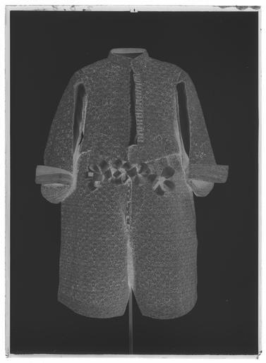 Keywords: Tröja av svart atlas, 1650-tal - Livrustkammaren - 10306-negative.tif LSH artwork Friderich Feuerbrun pärlstickare David Pärlestickare pärlstickare sv Detta är en dräkt som man mycket gärna skulle vilja sätta i samband med Karl X Gustavs kröning men det finns ännu inget dokumentariskt bevis för detta dräkten ingår ev i fransyska varorna Det är en synnerligen rikt utstyrd dräkt och den har såväl i sitt broderi som i sin foder brokad en ovanligt hög guldhalt I 1671 års inventarium sägs det att dräkten utgörs av kappa tröja byxor knäband skorosor och handskar Allt av svart atlas med Gull heelöfwer borderat Numera är tyvärr dräkten inte längre så fullständig både 1671 och 1676 års inventarier vittnar visserligen om kappans existens men därefter är den försvunnen man hade redan 1671 tagit bort spetsarna av guld och 20 år senare omtalas kappan ej längre Nuvarande inventarium omtalar blott tröja byxor och 1 handske Under ett annat inventarienummer 3435 har emellertid kunnat identifieras ett dräkttillbehör nämligen ett gehäng med samma broderi Den svarta atlasen har en vådbredd av ca 53 cm utan stad Staden är 1 3 cm bred 10 gröna 10 vita 10 gröna 10 vita 10 gröna samt 5 tjocka svarta trådar - tuskaft Trådarnas antal kan variera Det hela ytan täckande broderiet är utfört i läggsöm och har en mönsterrapport av h 10 cm b 6 8 cm Det är utfört med olika sorters guldkantiljer samt paljettsträngar Längs en del kantsömmar har man sytt på ett smalt guldsnöre bestående av en tvinnad tråd omspunnen med lan Broderiet är nersytt med vitt och gult silke samt tjockare rosa lintråd <br/>Analysresultat Tråd och lan av legerat guld huvudbeståndsdelar <br/>Silver xx<br/>Guld xxx<br/>Koppar xxx<br/>Zink 0<br/>Mönstret är ett stiliserat blomstermönster där ett ringformigt omtag snarast utvecklats till en krona som utdragna klockliknande blomkalkar vända sig till eller ifrån I plaggen kan man observera att broderiet uppvisar olika kvaliteter och här kan även spåras skarvar i tyget underlaget De tillskurna bitarna uppvisa en klumpigare torrare karaktär i broderiets utförande samt smärre avvikelser från det gängse utförandet Så t ex har i tröjan den lilla 5-bladiga blomman ovanför kronan sitt översta mellersta blad sytt med horisontella kantiljer istället för vertikala som det borde varit Mönstret är också gyttrigare och oredigare Kronans tinnar är omramade av i öglor lagda konturtrådar och ej som i det ursprungliga broderiet där konturen går upp och ned <br/>Mönsterrapport ca h 77 mm b 58 mm Tröjan av innocenttyp är sydd med 2 framstycken som utökats såväl upptill på axelpartiet som utefter ärmringningen och längs sidosömmen med tillsatta bitar I ryggen har skarvstyckena infogats längs en mittsöm ursprungligen kunde ryggstycket ha varit helt Nu ligger emellertid på ömse sidor mittsömmen en smal blott 1 5 cm bred skarv Likaså har man även baktill gjort tröjan något längre genom skarvar utefter axel- och halsringningarna Ärmarna har bara utvidgats obetydligt genom en skarvad remsa utefter underärmstyckets bakre övre del samt på bägge styckena nertill utefter ytterkantens söm ärmsprundets sida ca 27 cm Kragen har klippts upp på samma sätt som ryggstycket så att intill mittsömmen 2 små skarvstycken ligga på ömse sidor synbarligen även placerade upp- och nedvända Tröjan har 10 skört och i midjesömmen sitta på insidan 8 st byxtampar vardera med 2 hål Fodret utgöres av guldbrokad med svart botten Det har en vådbredd av minst 47 cm ev ca52 x 14 á 15 tr/cm2 Det är en ripsvävnad med varp av svart otvinnat silke Inslagen är 14 st med gult silke högertvinnad med guldlan samt 14 st med gult silke högertvinnad med guldlan samt 14 st svarta med guldlan på rätan Stad ca 1 3 cm 8 gröna 9 vita 12 gröna 8 vita 11 gröna 6 svarta trådar - de färgade i atlasbindning de svarta i lärftsbindning Mönsterrapport h 7 7 cm b 5 8 Mönstret består av halvnaturalistiska små blomsterkvistar <br/>Analysresultat Metalltråd tvinnad med textiltråd huvudbeståndsdelar <br/>Silver xxx<br/>Guld xx<br/>Koppar xx<br/>Zink 0<br/>Då fodret är mycket trasigt och slitet har man fodrat in kragen och den övre delen av tröjan med svart taft Skörten som ju också är fodrade med brokaden har fått bitar av denna på varierande led Man har givetvis velat utnyttja det dyrbara materialet till fullo I framkanten på vänster sida har tröjan en knapphålsrad med 23 knapphål 2 cm långa På motstående sida finns 22 knappar i behåll de är 1 2 cm i diameter Knapphålsraden är på undersidan fodrad med guldbrokad av samma typ som finns i byxornas fickor Nertill i framstyckena finns planschetter som når t o m det 13 e knapphålet eller är ca 22 cm långa Dessa är klädda med något grövre linnelärft än den oblekta linnelärft som utgör mellanfoder i tröjan 23x18 tr/cm2 Det finns 3 knappar med tränsar i ståndkragen Knapparna är överklädda med olika guldtrådar lan och kantiljer I midjan på tröjan har man mellan fodren lagt en avklippt stadremsa vävd randig i gult och orange med svart som ev är en avklippt stad från någon annan dräkts tyg ev den oskurna svarta sammetsdräkten nr 3421 Detta för att ge mera styrsel åt plagget Att man klippt till plaggets olika delar och beräknat sömmarnas placering innan man broderat dem visar bl a ärmarnas nedre parti som på den broderade sidan ju skulle vikas till uppslag De har alltså ej behövt broderas ända ned utan man har lämnat den svarta atlasen bar på ett knappt 10 cm brett stycke Blott mitt fram på högra sidan under knappraden finns en knypplad ca 1 7 cm bred guldspets med guldlan kvar original caption Karl X Gustavs kröning Kristinas kröning Karl X Gustav och Hedvig Eleonoras bröllop 1647 brocade d2 - dräkt - foder material guldbrokad - silk Färg svart d1 - dräkt - yttermaterial material atlas LRK Karl X Gustav av Sverig