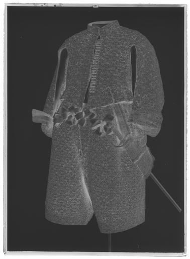 Keywords: Tröja av svart atlas, 1650-tal - Livrustkammaren - 1746-negative.tif LSH artwork Friderich Feuerbrun pärlstickare David Pärlestickare pärlstickare sv Detta är en dräkt som man mycket gärna skulle vilja sätta i samband med Karl X Gustavs kröning men det finns ännu inget dokumentariskt bevis för detta dräkten ingår ev i fransyska varorna Det är en synnerligen rikt utstyrd dräkt och den har såväl i sitt broderi som i sin foder brokad en ovanligt hög guldhalt I 1671 års inventarium sägs det att dräkten utgörs av kappa tröja byxor knäband skorosor och handskar Allt av svart atlas med Gull heelöfwer borderat Numera är tyvärr dräkten inte längre så fullständig både 1671 och 1676 års inventarier vittnar visserligen om kappans existens men därefter är den försvunnen man hade redan 1671 tagit bort spetsarna av guld och 20 år senare omtalas kappan ej längre Nuvarande inventarium omtalar blott tröja byxor och 1 handske Under ett annat inventarienummer 3435 har emellertid kunnat identifieras ett dräkttillbehör nämligen ett gehäng med samma broderi Den svarta atlasen har en vådbredd av ca 53 cm utan stad Staden är 1 3 cm bred 10 gröna 10 vita 10 gröna 10 vita 10 gröna samt 5 tjocka svarta trådar - tuskaft Trådarnas antal kan variera Det hela ytan täckande broderiet är utfört i läggsöm och har en mönsterrapport av h 10 cm b 6 8 cm Det är utfört med olika sorters guldkantiljer samt paljettsträngar Längs en del kantsömmar har man sytt på ett smalt guldsnöre bestående av en tvinnad tråd omspunnen med lan Broderiet är nersytt med vitt och gult silke samt tjockare rosa lintråd <br/>Analysresultat Tråd och lan av legerat guld huvudbeståndsdelar <br/>Silver xx<br/>Guld xxx<br/>Koppar xxx<br/>Zink 0<br/>Mönstret är ett stiliserat blomstermönster där ett ringformigt omtag snarast utvecklats till en krona som utdragna klockliknande blomkalkar vända sig till eller ifrån I plaggen kan man observera att broderiet uppvisar olika kvaliteter och här kan även spåras skarvar i tyget underlaget De tillskurna bitarna uppvisa en klumpigare torrare karaktär i broderiets utförande samt smärre avvikelser från det gängse utförandet Så t ex har i tröjan den lilla 5-bladiga blomman ovanför kronan sitt översta mellersta blad sytt med horisontella kantiljer istället för vertikala som det borde varit Mönstret är också gyttrigare och oredigare Kronans tinnar är omramade av i öglor lagda konturtrådar och ej som i det ursprungliga broderiet där konturen går upp och ned <br/>Mönsterrapport ca h 77 mm b 58 mm Tröjan av innocenttyp är sydd med 2 framstycken som utökats såväl upptill på axelpartiet som utefter ärmringningen och längs sidosömmen med tillsatta bitar I ryggen har skarvstyckena infogats längs en mittsöm ursprungligen kunde ryggstycket ha varit helt Nu ligger emellertid på ömse sidor mittsömmen en smal blott 1 5 cm bred skarv Likaså har man även baktill gjort tröjan något längre genom skarvar utefter axel- och halsringningarna Ärmarna har bara utvidgats obetydligt genom en skarvad remsa utefter underärmstyckets bakre övre del samt på bägge styckena nertill utefter ytterkantens söm ärmsprundets sida ca 27 cm Kragen har klippts upp på samma sätt som ryggstycket så att intill mittsömmen 2 små skarvstycken ligga på ömse sidor synbarligen även placerade upp- och nedvända Tröjan har 10 skört och i midjesömmen sitta på insidan 8 st byxtampar vardera med 2 hål Fodret utgöres av guldbrokad med svart botten Det har en vådbredd av minst 47 cm ev ca52 x 14 á 15 tr/cm2 Det är en ripsvävnad med varp av svart otvinnat silke Inslagen är 14 st med gult silke högertvinnad med guldlan samt 14 st med gult silke högertvinnad med guldlan samt 14 st svarta med guldlan på rätan Stad ca 1 3 cm 8 gröna 9 vita 12 gröna 8 vita 11 gröna 6 svarta trådar - de färgade i atlasbindning de svarta i lärftsbindning Mönsterrapport h 7 7 cm b 5 8 Mönstret består av halvnaturalistiska små blomsterkvistar <br/>Analysresultat Metalltråd tvinnad med textiltråd huvudbeståndsdelar <br/>Silver xxx<br/>Guld xx<br/>Koppar xx<br/>Zink 0<br/>Då fodret är mycket trasigt och slitet har man fodrat in kragen och den övre delen av tröjan med svart taft Skörten som ju också är fodrade med brokaden har fått bitar av denna på varierande led Man har givetvis velat utnyttja det dyrbara materialet till fullo I framkanten på vänster sida har tröjan en knapphålsrad med 23 knapphål 2 cm långa På motstående sida finns 22 knappar i behåll de är 1 2 cm i diameter Knapphålsraden är på undersidan fodrad med guldbrokad av samma typ som finns i byxornas fickor Nertill i framstyckena finns planschetter som når t o m det 13 e knapphålet eller är ca 22 cm långa Dessa är klädda med något grövre linnelärft än den oblekta linnelärft som utgör mellanfoder i tröjan 23x18 tr/cm2 Det finns 3 knappar med tränsar i ståndkragen Knapparna är överklädda med olika guldtrådar lan och kantiljer I midjan på tröjan har man mellan fodren lagt en avklippt stadremsa vävd randig i gult och orange med svart som ev är en avklippt stad från någon annan dräkts tyg ev den oskurna svarta sammetsdräkten nr 3421 Detta för att ge mera styrsel åt plagget Att man klippt till plaggets olika delar och beräknat sömmarnas placering innan man broderat dem visar bl a ärmarnas nedre parti som på den broderade sidan ju skulle vikas till uppslag De har alltså ej behövt broderas ända ned utan man har lämnat den svarta atlasen bar på ett knappt 10 cm brett stycke Blott mitt fram på högra sidan under knappraden finns en knypplad ca 1 7 cm bred guldspets med guldlan kvar original caption Karl X Gustavs kröning Kristinas kröning Karl X Gustav och Hedvig Eleonoras bröllop 1647 brocade d2 - dräkt - foder material guldbrokad - silk Färg svart d1 - dräkt - yttermaterial material atlas LRK Karl X Gustav av Sverige