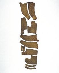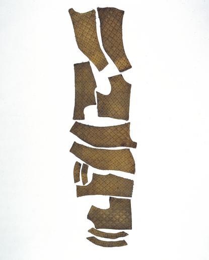 | Keywords: Tröja, delar, sämskskinn - Livrustkammaren - 47513.tif LSH artwork sv Tröjan är av en modell med liv i fyra delar med söm mittbak och sidsömmarna förskjutna bakåt samt kragens bakdel i ett med ryggstyckena Ärmarna är av tvåsöms typ och skörtet består av fyra delar Av tröjan har bevarats 2 framstycken 2 bakstycken 2 ytterärmar 2 innerärmar 2 skört fram och 2 skört bak Delarnas rätsida är av sämskskinn som dubblerats med grovt glest oblekt linne De båda lagren hålls samman av yttäckande broderier i guld silver och silke Delarna visar inga tecken på att någonsin ha varit ihop sydda till ett plagg De förvaras nu i två buntar sammanhållna av ett stygn i ovankanten Framstyckena har en rak framkant och en aningen svängd nederkant Framstyckenas hela längd är 44 5 cm Framkantens längd är 35 5 cm och sidsömmens längd är 23 cm Sträckan mellan ärmhålet och midjan mäter 20 8 cm och axellinjen är 14 2 cm Bakstyckena är tillskurna i ett med kragens bakstycken Rygglinjen är rak men ställs ut något när den går över i kragen Sidsömslinjen är rak Ärmhålet bak är grunt och rakt Bakstyckenas hela längd är 54 3 cm var av rygglängden är ca 42 cm och kragen ca 12 cm Sidsömmslinjen är 25 cm och midjevidden 16 5 cm Bröstvidden är 20 8 cm Kragen är i ovankanten 11 7 cm bred och axel-krag-linjen är 25 5 cm Ärmarna har en böjd form och är konstruerade i två delar Ytter- och innerärmslinjerna är lika till form och storlek Vid innerärmens bakre söm bildas ett hörn mot ärmens ringning Höjdskillnaden mellan ärmkullen och ringningen är relativt liten Ärmstyckenas hela längd är 65 cm Baksömmens längd är 69 5 cm och framsömmens längd är 56 cm Handledsvidden är 11/13 cm armbågsvidden 20 5 cm och överarmsvidden 23 cm Höjdskillnaden mellan kullen och ringningen är 5 cm och innerärmens hörn är 4 5/6 cm brett Skörtet är i fyra delar två längre och två kortare vars midjelinjer motsvarar livets fram- resp bakstycken Skörtdelarna är svängda och avslutas framtill i spetsar Bakskörten är 5 5 cm breda De mäter 17 5 cm i midjelinjen och 21 5 cm i ytterkanten Framskörten är 5 5 cm breda De mäter 31 5 cm i midjelinjen och 43 cm i ytterkanten Samtliga plaggdelar har ett heltäckande broderi i silke guld och silver Ytan täcks av slingor av mörkbrunt silke och guld i läggsöm vilka bildar kartuscher I dessa är inskrivna stiliserade nejlikor i klargrönt och laxrosa silke och med konturer av enkel silversnodd Blommorna omges av spridda knutar i samma gröna silke Broderiet är utfört i plattsöm och läggsöm Flera av delarna har rester av brun tjock lintråd som tidigare tycks ha hållit dem samman Möjligen gjort av brodören i samband med leverans De hålls nu samman av en grov blank svart tråd i två buntar En innehållande fram- bak- och ärmdelar den andra innehållande delarna till skörtet original caption tröja delar sämskskinn LRK 20602 Johan Kasimir och Katarina av Sveriges bröllop decade 1610 size mm 445 liv size mm 355 framkant size mm 420 rygg size mm 120 krage bak size mm 695 ärm LRK Gustav II Adolf 1994-1995 Modelejon 2002 Maria Eleonora - Hjärtats drottning 2013 Livrustkammaren Maria Eleonora - Hjärtats drottning arb namn 2014-2015 Nyköpingshus place of origin original filename lm_t05462 57154 inventory number LRK 20602 47513 CC-BY-SA Shirts Media contributed by LSH unmatched event Media contributed by LSH dim-with multiple size templates Media contributed by LSH 2014-11 |