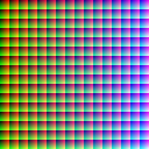 | Keywords: True colour.PNG en Full true colour 24-bit RGB palette The red shade changes by 1 across the y-axis the green shade changes by 1 across the x-axis and the blue changes by 1 in each new 256 256 block There is a total of 256 256 256 or 16 777 216 colours The final 4096 4096 image was too large to make all at once in Java the virtual machine reports java lang OutOfMemoryError Java heap space so I made this by splitting it into four different sections top left top right bottom left and bottom right and combining them in MS paint The program to make such a simple image is therefore pretty complex and requires 8 classes to make it work own 06 57 21 May 2010 UTC Simpsons contributor talk Simpsons contributor en Original upload log en wikipedia FtCG page en wikipedia True_colour PNG wikitable - 00 47 29 September 2012 4 096 × 4 096 56 030 bytes DMahalko w en <nowiki> Reverted to version as of 04 51 18 June 2012 - Size reduction to 2048x2048 results in a non-accurate image Image size must remain 4096x4096 to encompass all 16 777 216 colors of the 24-bit palette If you want a smaller inaccurate substitute upload </nowiki> - 20 10 13 August 2012 2 048 × 2 048 51 899 bytes Ronhjones w en <nowiki> Image display issue cannot be fixed by optimisation - it's just too many pixels the only way to display is to do a 2 into 1 reduction </nowiki> - 04 51 18 June 2012 4 096 × 4 096 56 030 bytes Julyo w en <nowiki> Optimized filesize with OptiPNG PNGOUT AdvPNG and DeflOpt; most optimization resulted from reducing colorspace from 32-bit RGBA to 24-bit RGB </nowiki> - 14 43 21 May 2010 4 096 × 4 096 23 227 397 bytes Simpsons contributor w en <nowiki> </nowiki> - 06 57 21 May 2010 4 096 × 4 096 23 261 227 bytes Simpsons contributor w en <nowiki> Full true colour 24-bit RGB palette The red shade changes by 1 across the y-axis the green shade changes by 1 across the x-axis and the blue changes by 1 in each new 256 256 block There is a total of 256 256 256 or 1 </nowiki> RGB |