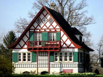 Keywords: truss fachwerkhaus home idyllic wood balcony weiherhuesli spring flowers brickyard pond amriswil thurgau switzerland