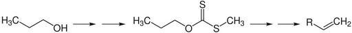 Keywords: Tschugajew-Bruttoreaktion-V1.svg de Als Tschugajew-Reaktion oder -Eliminierung bezeichnet man die Dehydratisierung von primären Alkoholen zu terminalen Alkenen own Faynara 2010-06-17 Chugaev elimination