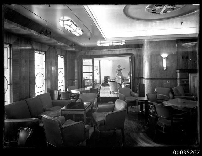 Keywords: hood collection hoodcollection 35267 samuel j hood collection samueljhoodcollection hood tss awatea tssawatea awatea union steam ship company unionsteamshipcompany union steamship company of new zealand unionsteamshipcompanyofnewzealand new zealand newzealand passenger seating area passengerseatingarea ship's interior shipsinterior 1930s furniture 1930sfurniture 1930s cruise liner cruiseliner passenger liner passengerliner passenger ships passengerships sydney circular quay circularquay maiden voyage maidenvoyage blackandwhite monochrome indoor coffee beverage food black and white This photograph depicts the passenger seating area on board TSS AWATEA. AWATEA, built in 1936, was owned by Union Steamship Company and was known as the 'Queen of the Tasman Sea'. It was a luxury liner that serviced the trans-Tasman route. AWATEA was requisitioned by the British Government during World War II and was sunk in 1942. This photo is part of the Australian National Maritime Museum’s Samuel J. Hood Studio collection. Sam Hood (1872-1953) was a Sydney photographer with a passion for ships. His 60-year career spanned the romantic age of sail and two world wars. The photos in the collection were taken mainly in Sydney and Newcastle during the first half of the 20th century. The ANMM undertakes research and accepts public comments that enhance the information we hold about images in our collection. This record has been updated accordingly. Photographer: Samuel J. Hood Studio Collection Object no. 00035267 This photograph depicts the passenger seating area on board TSS AWATEA. AWATEA, built in 1936, was owned by Union Steamship Company and was known as the 'Queen of the Tasman Sea'. It was a luxury liner that serviced the trans-Tasman route. AWATEA was requisitioned by the British Government during World War II and was sunk in 1942. This photo is part of the Australian National Maritime Museum’s Samuel J. Hood Studio collection. Sam Hood (1872-1953) was a Sydney photographer with a passion for ships. His 60-year career spanned the romantic age of sail and two world wars. The photos in the collection were taken mainly in Sydney and Newcastle during the first half of the 20th century. The ANMM undertakes research and accepts public comments that enhance the information we hold about images in our collection. This record has been updated accordingly. Photographer: Samuel J. Hood Studio Collection Object no. 00035267 |