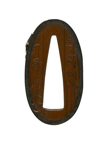 Keywords: Tsuchiya Takechika - Fuchi with Travelers' Accessories - Walters 511008 - Mark A.jpg This fuchi depicts a walking stick and a wicker backpack These items were often carried by traveling monks 3rd quarter 19th century late Edo-Meiji shibuichi gold cm 3 7 accession number 51 1008 23536 William T / Henry Walters Collection Baltimore date and mode of acquisition unknown Walters Art Museum Henry Walters Acquired by William T or Henry Walters Signature Issai Hogen kao place of origin Edo present-day Tokyo Japan Walters Art Museum license Tosogu Japanese sword fittings in the Walters Art Museum Tsuchiya Takechika Media contributed by the Walters Art Museum needs category review Media contributed by the Walters Art Museum needs artist update