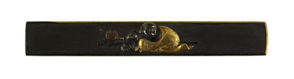Keywords: Tsuchiya Yasuchika - Kozuka with Hotei - Walters 51685.jpg Hotei is one of the seven gods of good fortune with his origins in both Taoist and Buddhist beliefs He is shown leaning against his bag of treasures On the left is a Chinese style fan that Hotei is often shown carrying His staff lays on the ground behind him The reverse is executed half in gold along the diagonal On the front this gives the kozuka a gold rim along the upper and right edge between 1730 1744 Edo shakudo gold silver cm 9 6 l accession number 51 685 28315 Henry Walters Baltimore date and mode of acquisition unknown Walters Art Museum Henry Walters Acquired by Henry Walters Signature Tôu place of origin Edo present-day Tokyo Japan Walters Art Museum license Kozuka in the Walters Art Museum Tosogu by Tsuchiya Yasuchika Tosogu by Tsuchiya Yasuchika in the Walters Art Museum Media contributed by the Walters Art Museum needs category review |