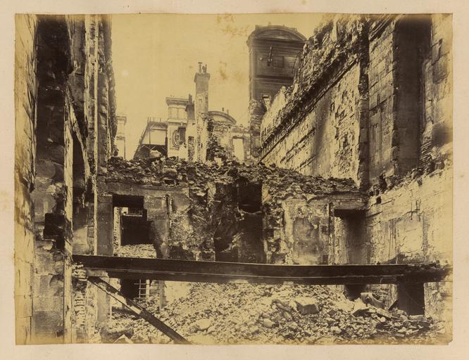 | Keywords: Tuileries Palace- View of the Destroyed Interior WDL1265.png Artwork ru Б аквейе Б уно 1823 1875 гг fr Braquehais Bruno 1823-1875 en Braquehais Bruno 1823-1875 zh 布鲁诺·布拉奇海 ,1823-1875 年 pt Braquehais Bruno 1823-1875 ar براكهيه برونو، 1823-1875 es Braquehais Bruno 1823-1875 ru Дво ец Тюиль и вид аз ушенного инте ье а fr Palais des Tuileries Vue de l intérieur détruit en Tuileries Palace View of the Destroyed Interior zh 伊勒里宫:被毁 的内部景观 pt Palácio das Tulherias Vista do interior destruído ar قصر التيليري منظر للجزء الداخلي المُتَحَطِّم ru П ичиной ф анко-п усской войны стал ост нап яженности в отношениях между Ф анцией и П уссией в 1860-х гг Ф анция п и импе ато е аполеоне III была полна ешимости п ове ить астущую силу П уссии и отомстить за то что она ассмат ивала как яд дипломатических унижений П уссия п и канцле е Отто фон Бисма ке считала что война ге манских госуда ств п отив Ф анции под уководством П уссии станет ешающим шагом к созданию единой Ге манской импе ии Конфликт начался 19 июля 1870 г когда Ф анция объявила войну Ф анцузская а мия оказалась ужасно неподготовленной и поте пела сок ушительное по ажение в битве п и Седане отк ыв до огу на Па иж К 19 сентяб я немцкие войска полностью ок ужили го од и начали осаду кото ая п одлилась более четы ех месяцев От езанные от поставок п одовольствия из сельской местности па ижане пытались выжить питаясь собаками кошками и даже животными из па ижского зоопа ка Де евья на Елисейских полях и в па ках были вы ублены и использованы в качестве топлива 5 янва я немецкие войска начали бомба ди овку го ода кото ая п одолжалась по несколько часов каждую ночь в течение 23 суток а ок естности Па ижа было сб ошено около 12 000 сна ядов кото ые убили около 400 человек Па иж сдался 28 янва я в сущности положив конец войне За по ажением ф анцузов последовало на одное восстание и установление в а те 1871г Па ижской коммуны еволюционного п авительства сфо ми ованного в соответствии с ана хистскими и социалистическими п инципами Коммуна была жестоко подавлена в мае 1871 г ф анцузскими войсками п авительства Адольфа Тье а Во в емя неп одолжительного конт оля над Па ижем коммуна ы аз ушали импе ато скую колонну на Вандомской площади Подавление коммуны п ивело к дальнейшим значительным аз ушениям в го оде когда коммуна ы подожгли дво ец Тюиль и Лув и д угие здания К оме того многие здания пост адали или были аз ушены во в емя отчаянной пе ест елки между коммуна ами и конт еволюционными силами Siege de Paris 1870 1871 Осада Па ижа 1870 1871 гг п едставляет собой альбом из 110 фотог афий сделанных Огюстом Б уно Б аквейе 1823 1875 гг ф анцузским фотог афом и п ог ессивным фотожу налистом документи овавшим осаду и последствия бомба ди овок а также аз ушения п оизошедшие во в емя Па ижской коммуны <br>Замки и дво цы; Ф анко-п усская война 1870 1871 гг ; Память ми а; Дво ец Тюиль и Па иж Ф анция ; Уще б нанесенный войной fr La guerre franco-allemande fut provoquée par l escalade des tensions entre la France et la Prusse dans les années 1860 La France sous l empereur Napoléon III était déterminée à contenir la croissance de la puissance prussienne et à venger ce qui était considéré comme une série d humiliations diplomatiques La Prusse sous le chancelier Otto von Bismarck considérait qu une guerre dirigée par la Prusse et menée par les États allemands contre la France serait un acte décisif menant à la création d un empire allemand unifié Le conflit débuta le 19 juillet 1870 jour où la France déclara la guerre L armée française s avéra terriblement mal préparée et subit une défaite désastreuse lors de la bataille de Sedan laissant la voie libre vers Paris Le 19 septembre les Allemands encerclèrent complètement la ville et commencèrent un siège qui allait durer plus de quatre mois Coupés du ravitaillement provenant de la campagne les Parisiens survécurent en mangeant les chiens les chats et même la plupart des animaux du zoo de Paris Les arbres des Champs-Élysées et des parcs furent coupés et brûlés po
