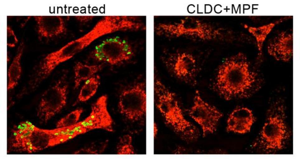 | Keywords: Tularemia Bacteria and Mouse Macrophages.jpg en Novel therapeutic protects against multiple bacterial pathogens The image taken with a fluorescent microscope shows mouse macrophages red 12 hours after infection with a virulent strain of Francisella tularensis stained green The cells on the left are untreated while the cells on the right were treated 3 days in advance with CLDC+MPF The untreated cells fail to control replication of F tularensis In contrast cells activated with the CLDC+MPF therapeutic have nearly eliminated all of the bacteria National Institute of Allergy and Infectious Diseases NIAID 2011-07-18 National Institutes of Health NIH National Institutes of Health NIH PD-USGov Uploaded with UploadWizard Tularemia |