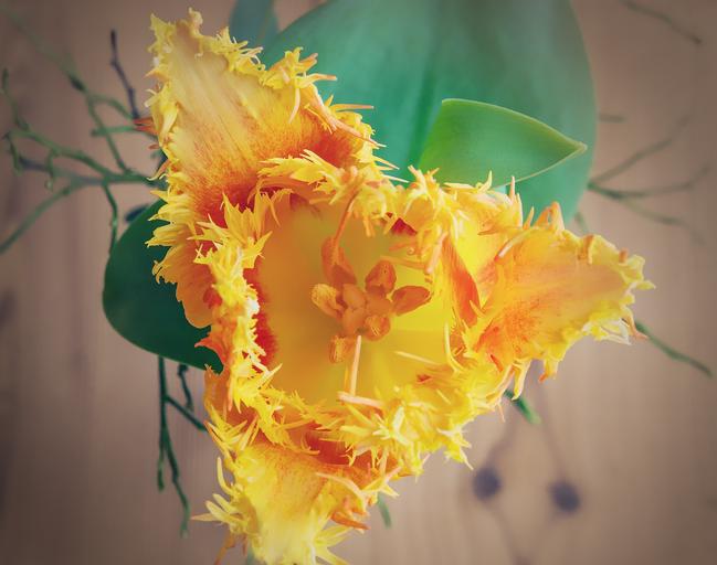 Keywords: tulip flower blossom bloom yellow orange schnittblume spring flower from above close
