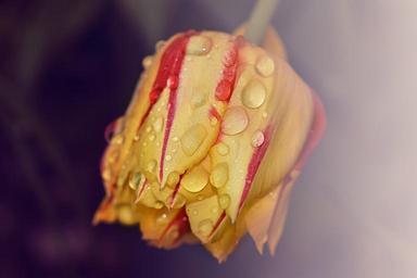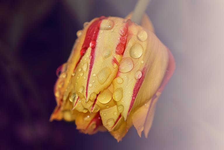 Keywords: tulip flower plant blossom bloom yellow red drop of water raindrop drip close