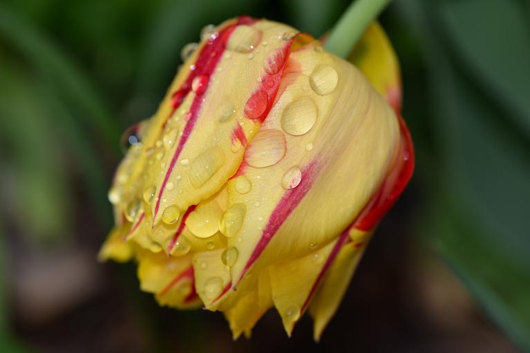 Keywords: tulip flower spring flower schnittblume garden nature blossom bloom yellow red beautiful drop of water raindrop close