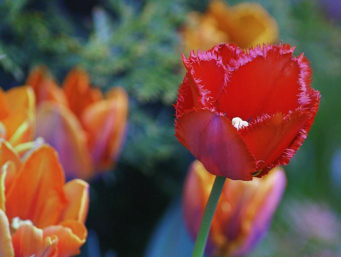 Keywords: tulips flowers red orange the blossoming of flowering chalices of flowers jagged tulip spring nature flora closeup garden flowers the background thuja the stems